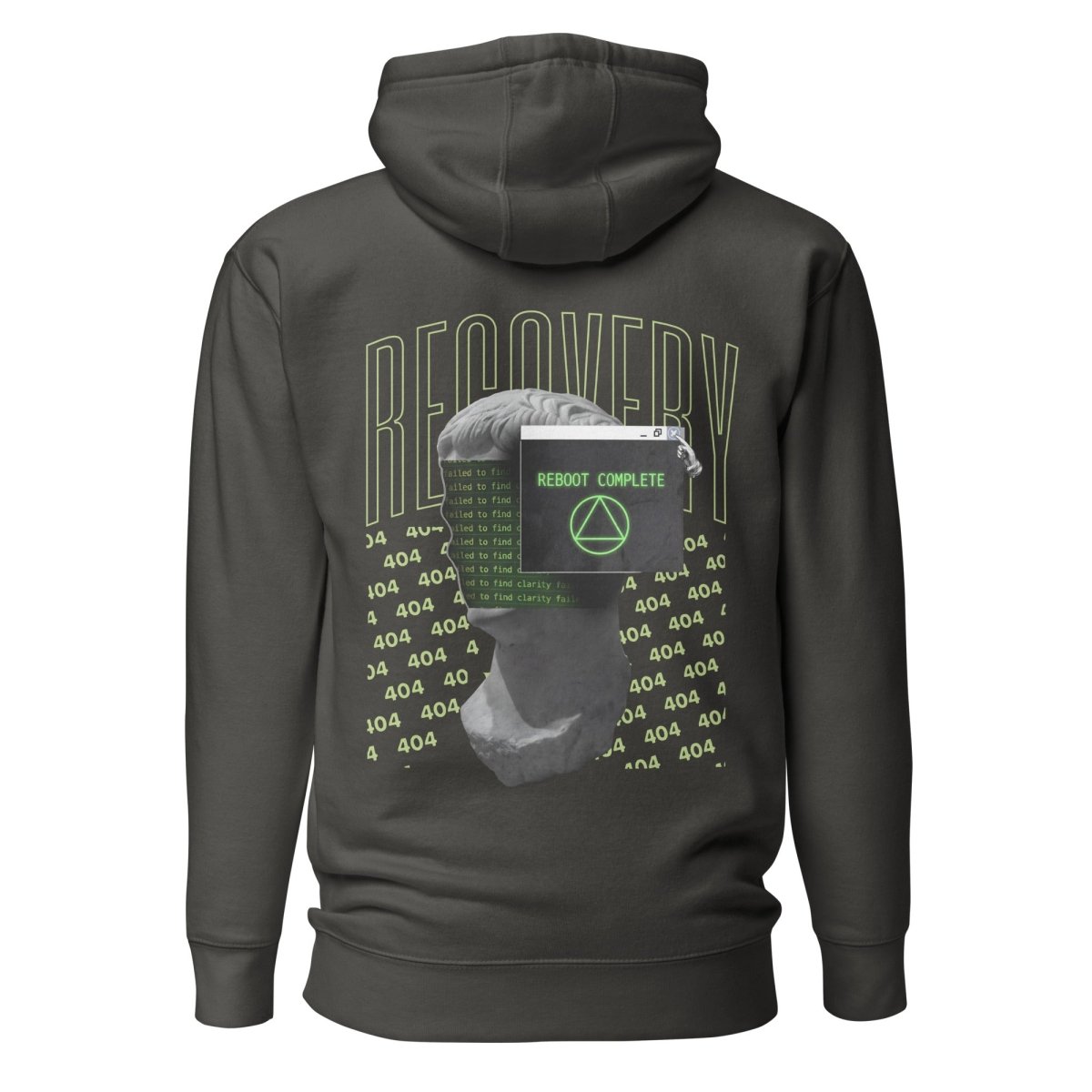 Back: The full story unfolds. At the center stands a fragmented Greco-Roman marble bust—timeless, broken, yet resilient. The face is overlaid with glitch-like lines of green code reading "failed to find clarity," evoking the chaos, confusion, and identity loss that often accompanies addiction.