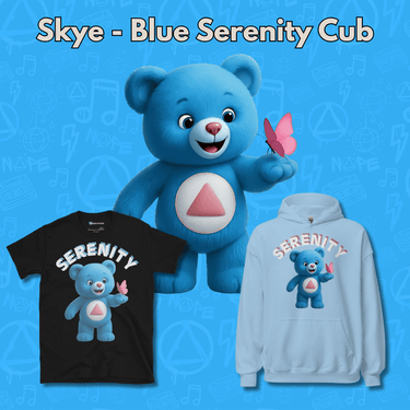This is Skye, the Blue Serenity Cub — wide-eyed, curious, and full of wonder. With a butterfly perched on her finger, Skye sees the world with fresh perspective. Her recovery journey is all about rediscovering joy, staying open to transformation, and finding peace in new beginnings. Her collection represents innocence restored and exploration of life, one sober day at a time.