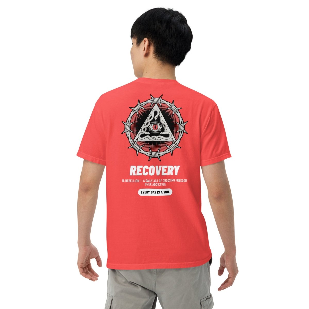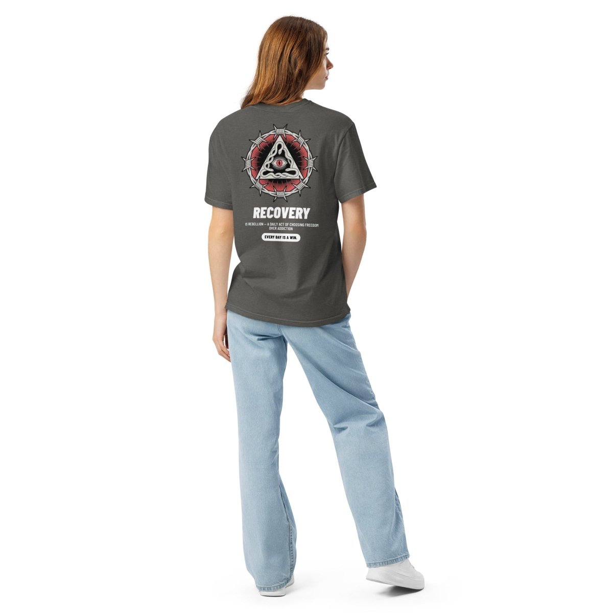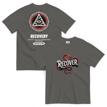 Vintage-dyed, ultra-durable, and 100% cotton. This heavyweight tee brings together comfort and conviction, showing your sobriety pride with artwork front and back. Because your recovery is worth wearing.