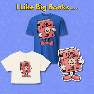 This collection is a playful shoutout to the iconic AA Big Book — reimagined as a cartoon character with charm, shoes, and a thumbs-up. Featuring the classic AA triangle and a witty lyric twist, these designs proudly celebrate sobriety, recovery, and the joy of personal growth. Perfect for those who walk the talk and read the book — because we like Big Books... and we cannot lie.