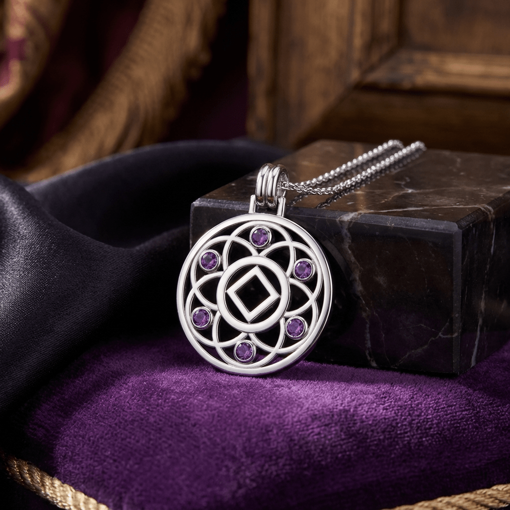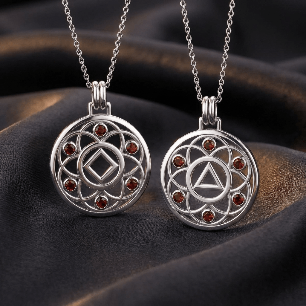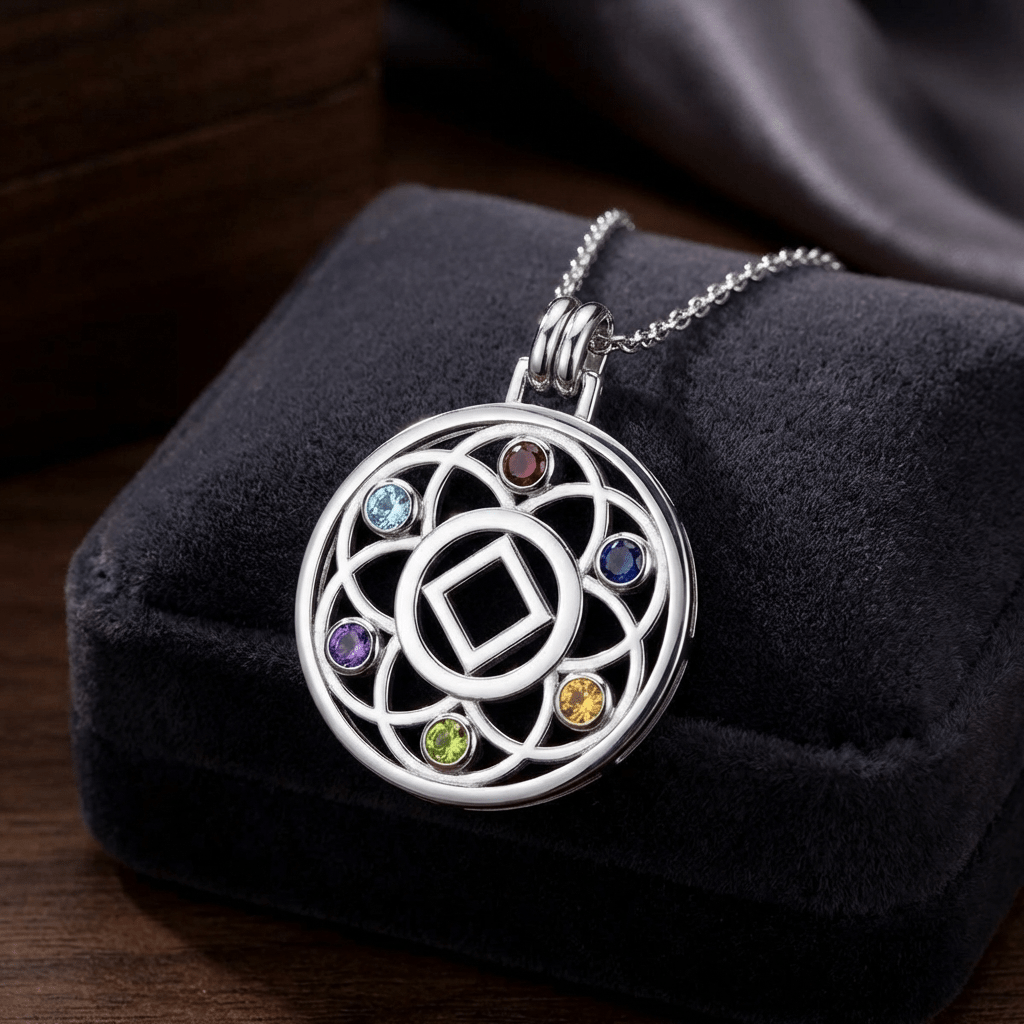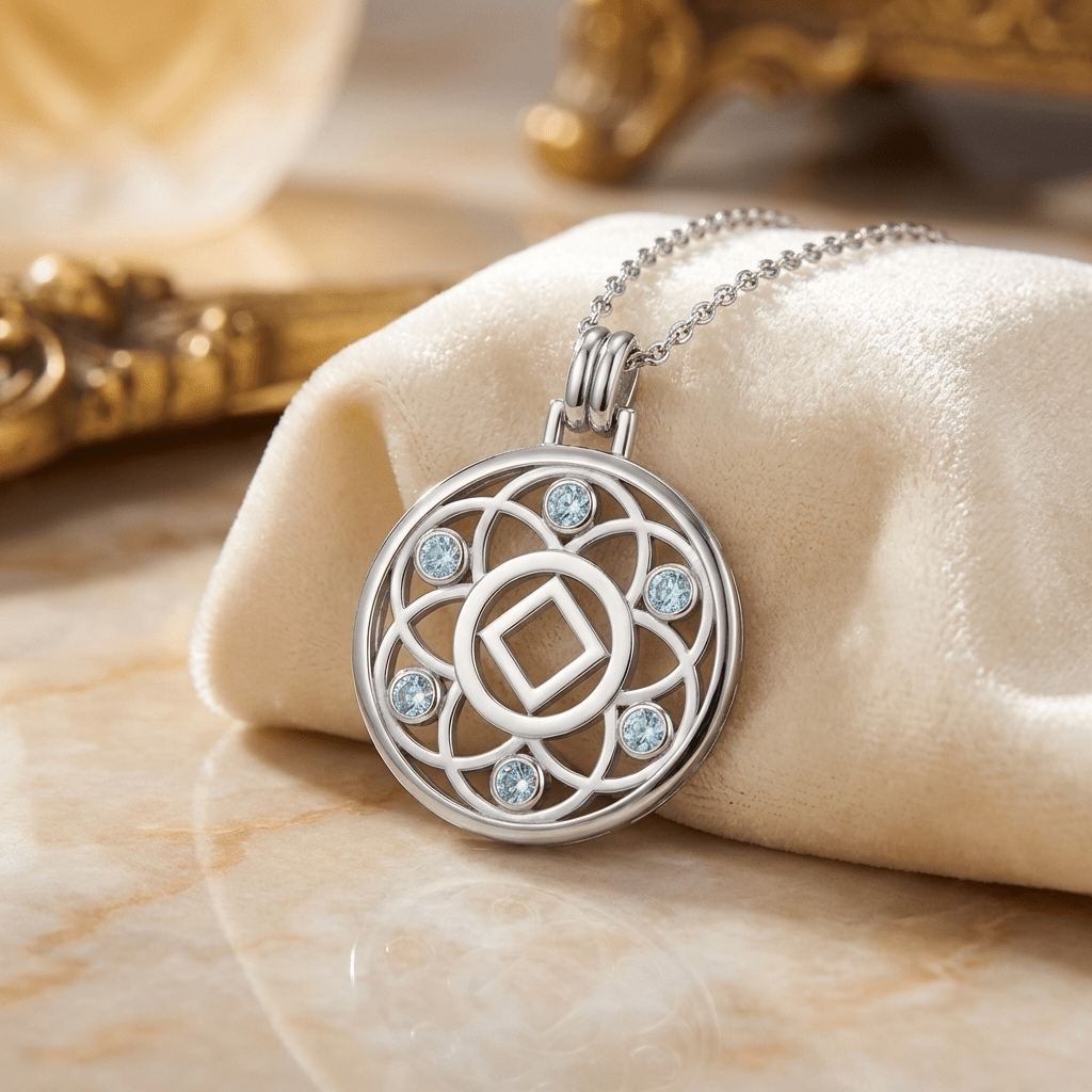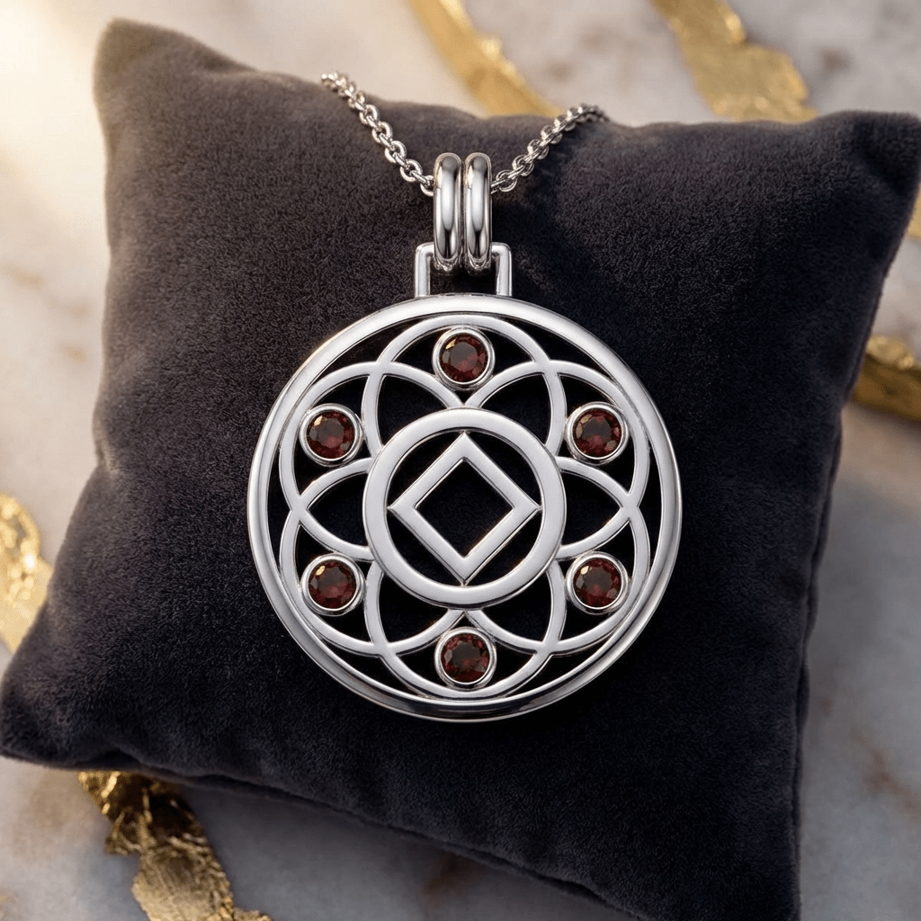Embrace growth, transformation, and the interconnected journey of recovery with the Flower of Life Sterling Silver Recovery Pendant, available with your choice of the AA (Alcoholics Anonymous) or NA (Narcotics Anonymous) Recovery symbol.
