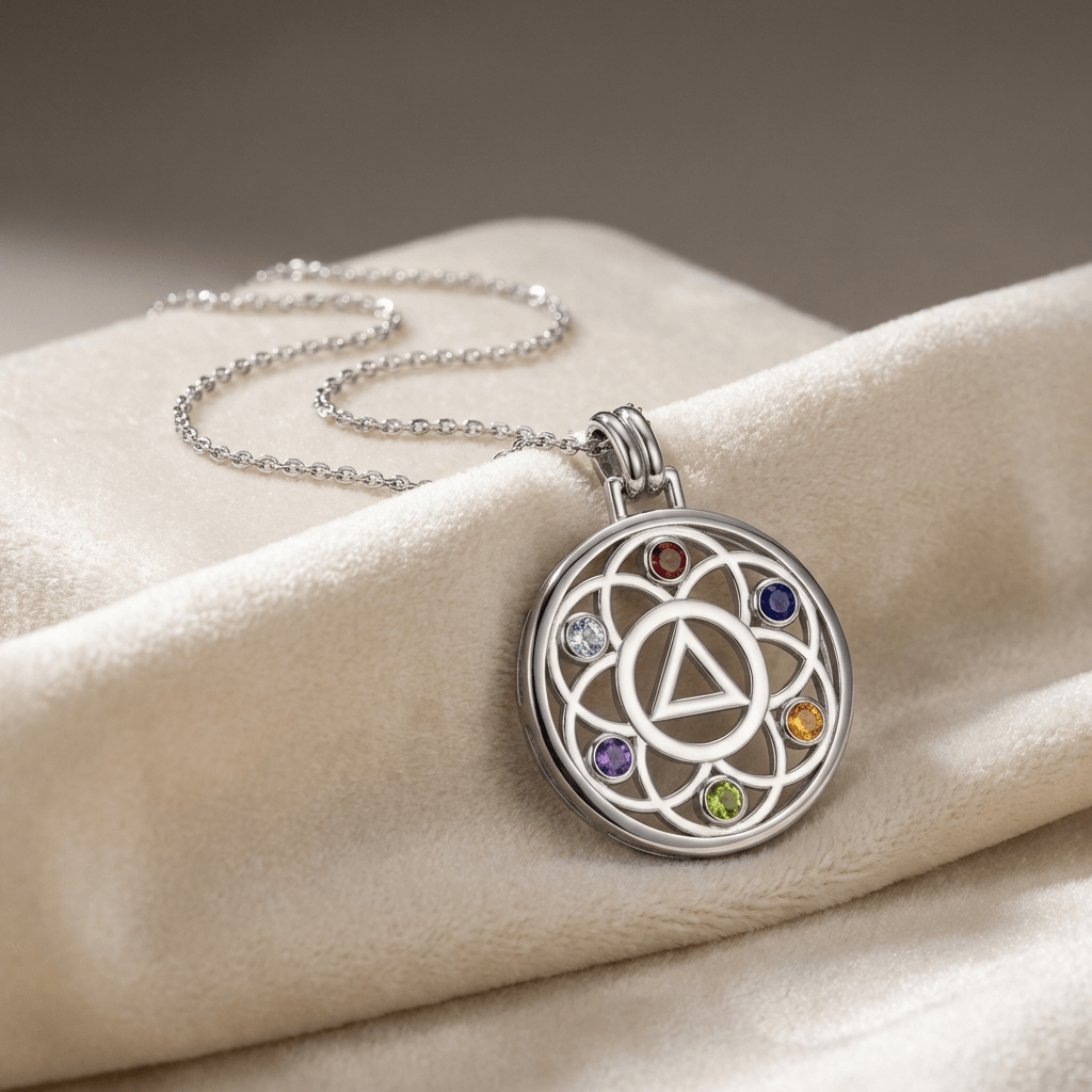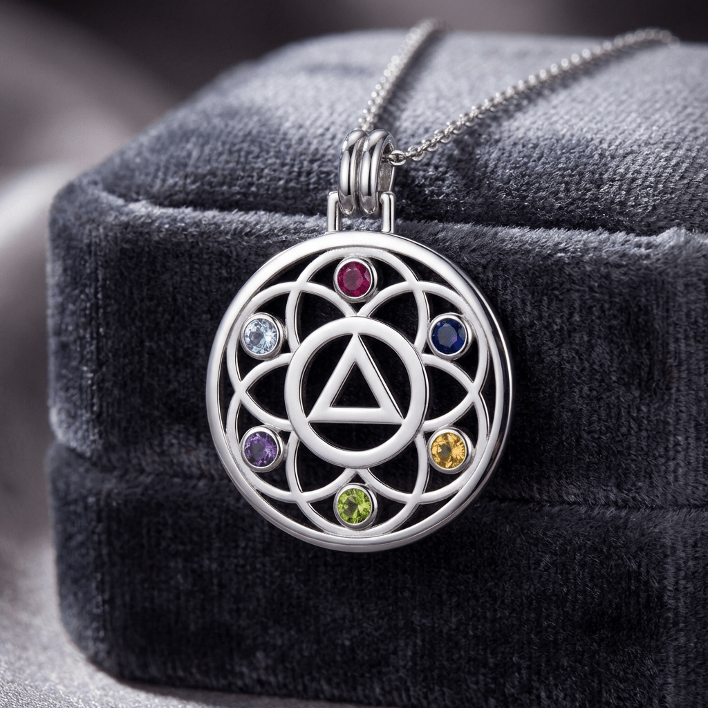 - Design Features: Flower of Life pattern with inlaid recovery symbol and genuine gemstone