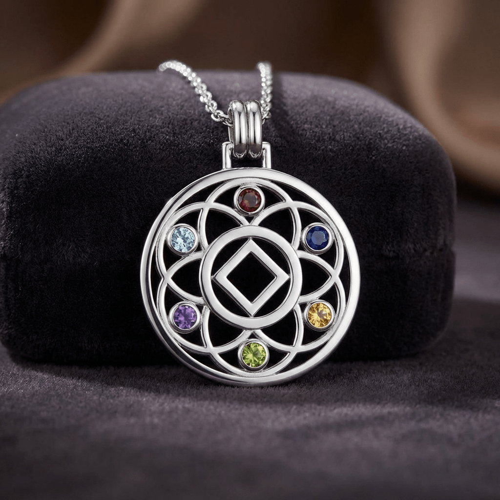 The Flower of Life is a sacred geometric symbol representing unity, balance, and infinite possibilities, making it the perfect emblem for personal transformation and the strength found in sobriety. At its center, the inlaid AA or NA symbol is enhanced by your choice of a genuine gemstone, adding a personalized touch to this meaningful piece.