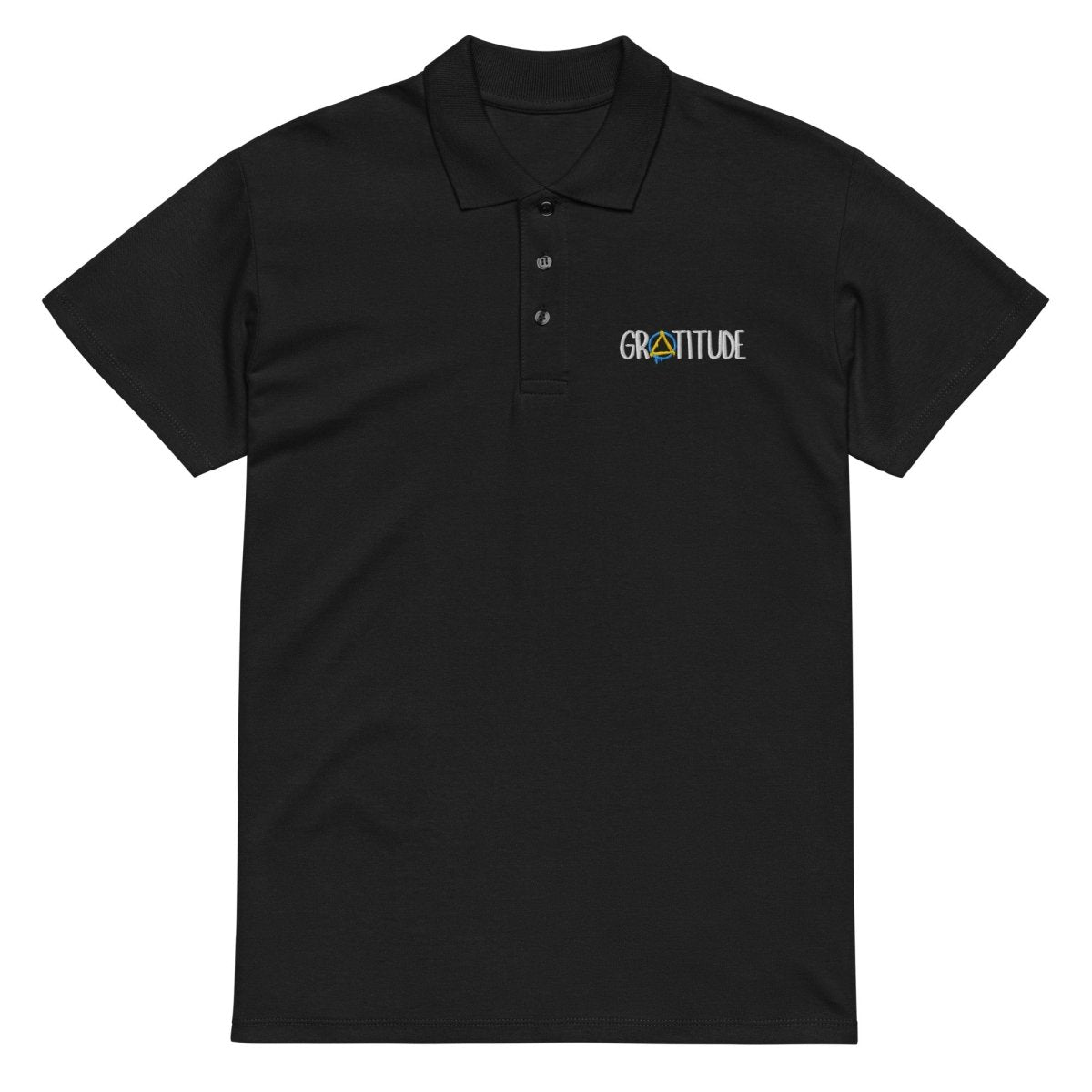 The Gratitude Embroidered Premium Pique Polo Shirt celebrates the transformative power of thankfulness in recovery. Featuring the word "GRATITUDE" with the letter A replaced by the graffiti sobriety symbol—a paint-dripping circle and triangle—this design merges street art energy with one of recovery's most essential principles.