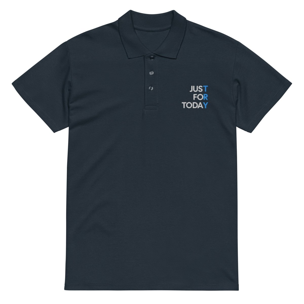 The Just For Today Embroidered Premium Pique Polo Shirt celebrates the most powerful principle in recovery: living in the present moment. Featuring the words "JUST FOR TODAY" stacked vertically with the letters T-R-Y highlighted in blue, this design reminds us that recovery isn't about forever—it's about right now, this moment, this day.