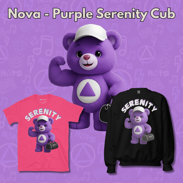 This isn’t just a sweatshirt—it’s a statement. Featuring Nova, the Purple Serenity Cub, this bold crewneck is all about channeling focus, fire, and freedom. Whether you’re headed to a meeting, a workout, or just holding your ground through the ups and downs of sobriety, this piece has your back.