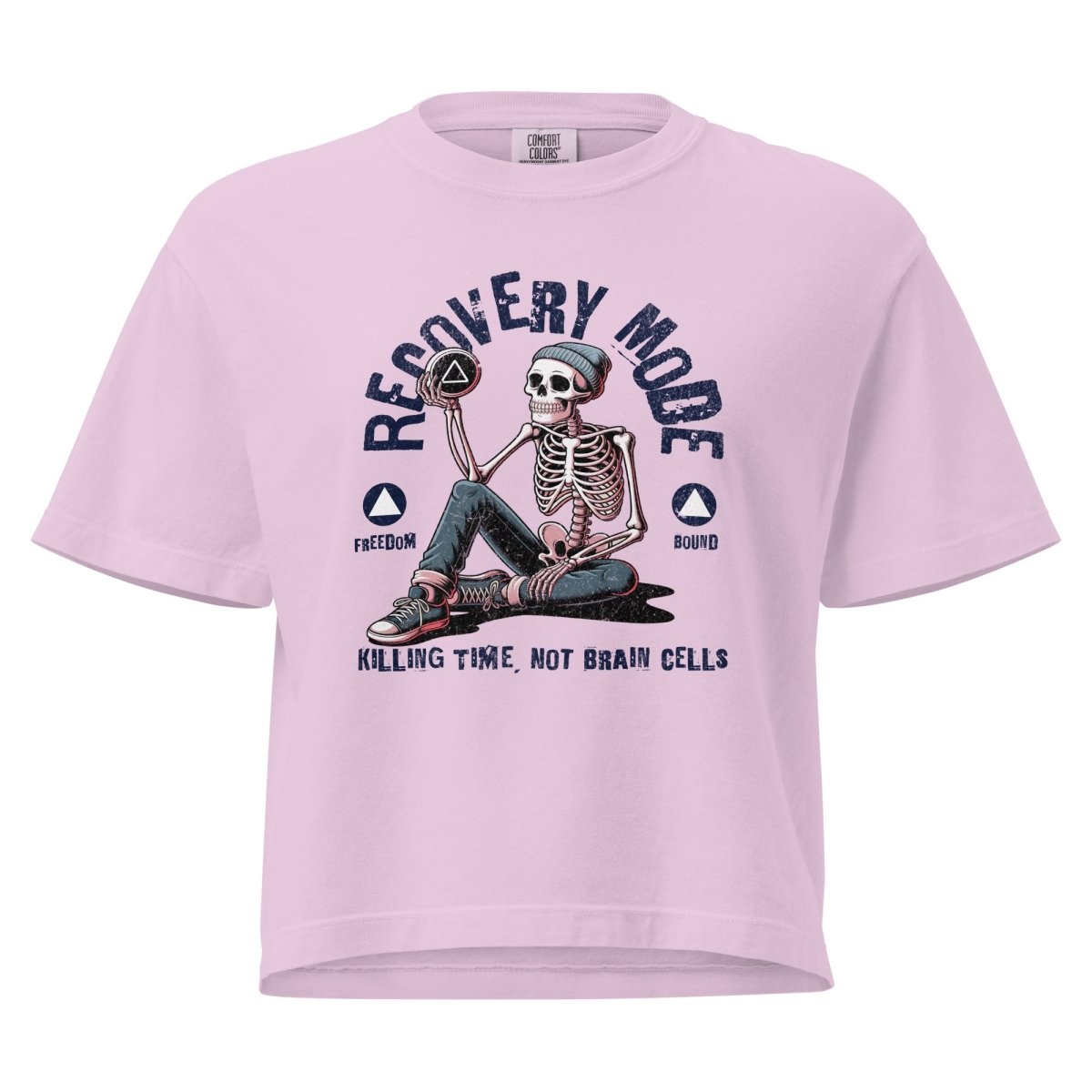 This Recovery Mode Skeleton Boxy Tee pairs a touch of humor with a powerful message: you're done killing brain cells — now you're killing time in peace. With a chill skeleton, headphones, and coffee in hand, this tee captures the quiet strength of sober living.