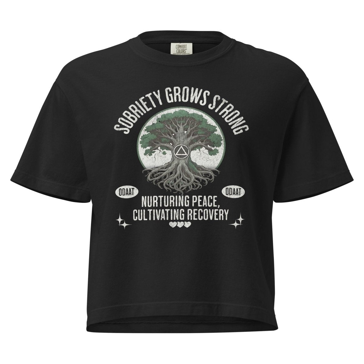 The Sobriety Grows Strong boxy tee is part of the Recovery Roots Collection—a tribute to the deep, personal journey of healing. Featuring a powerful tree design symbolizing growth, strength, and connection, this women’s heavyweight tee is made with soft, garment-dyed cotton and a relaxed, cropped fit.