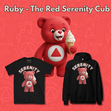 Meet Ruby, the Red Serenity Cub — a joyful reminder that sobriety doesn’t mean the end of fun. With her ice cream cone in hand and sprinkles on her nose, Ruby celebrates the simple, innocent pleasures that come with recovery. Her collection is all about savoring the moment, staying present, and learning to enjoy life’s sweetness again — without substances.