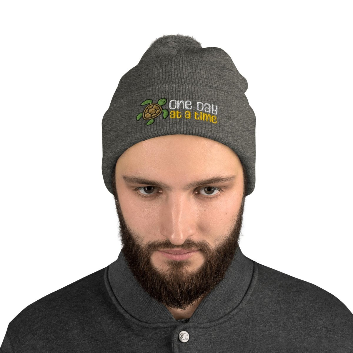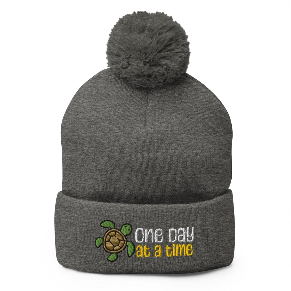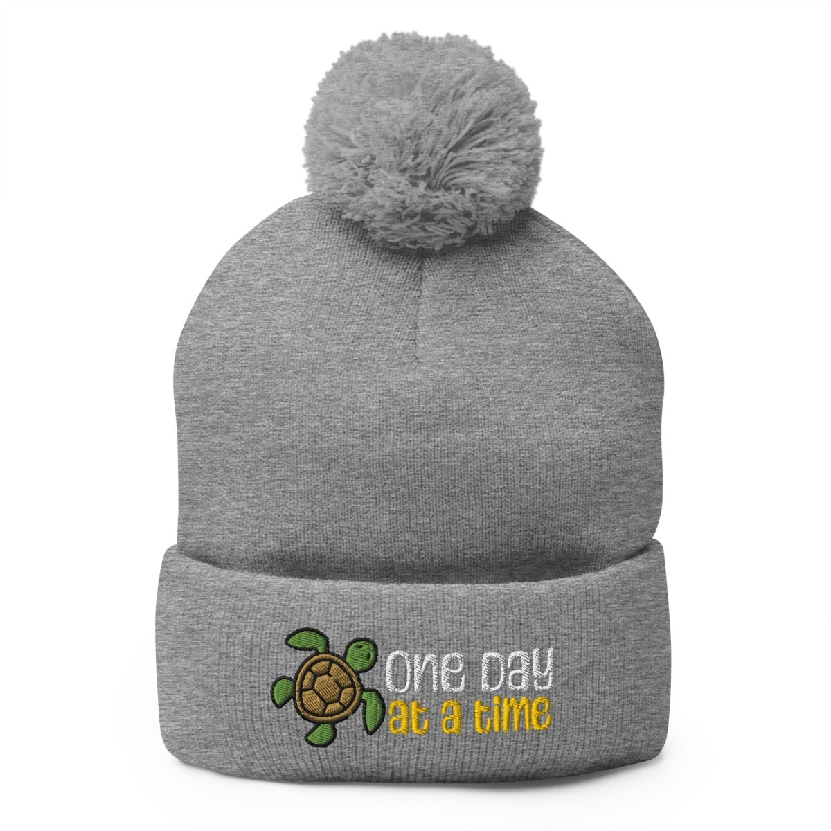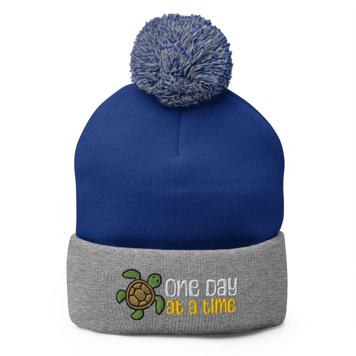 One Day at a Time Pom-Pom Beanie – Turtle Design for Warm Progress