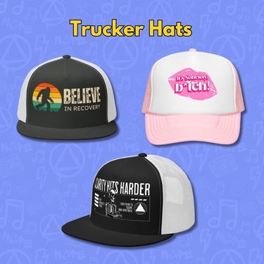 Our trucker hats are made to stand out and speak up. With breathable mesh backs, structured fronts, and adjustable snap closures, these hats offer all-day comfort and all-season versatility. Each design features a powerful message rooted in recovery, resilience, and real-life change. Whether you're hitting the road, the gym, or just running errands, these hats keep your purpose front and center—loud, proud, and unapologetically sober.