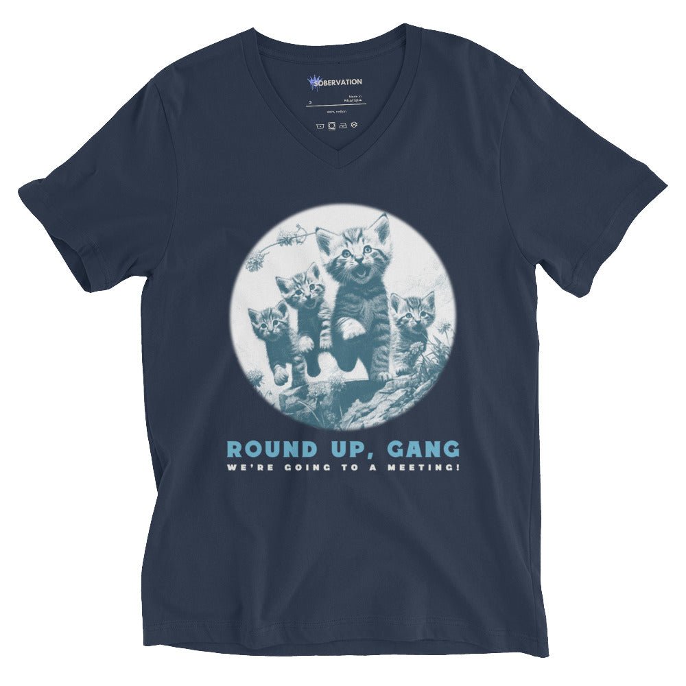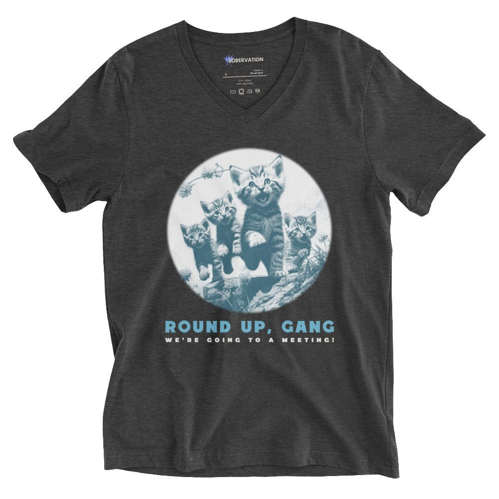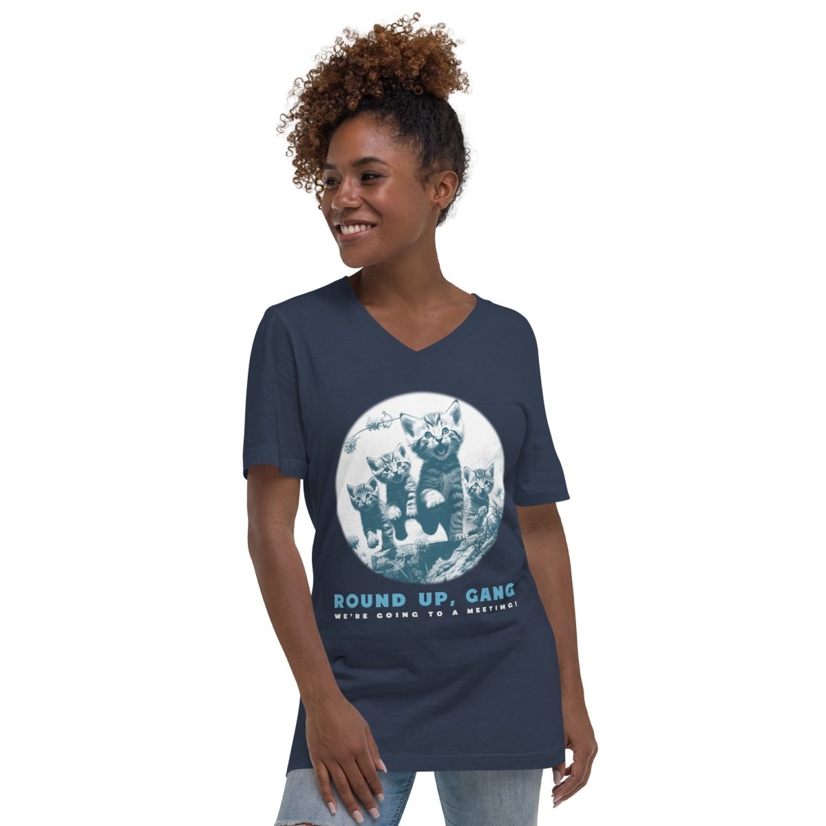 Round-Up Gang Cats “Meeting Time” V-Neck Tee – Feline Fine in Recovery