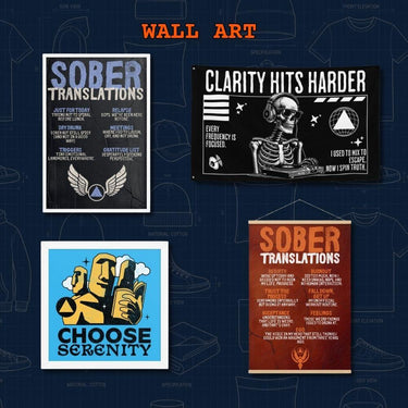 Each piece is crafted to elevate your space with purpose—whether you're embracing sobriety, mindfulness, or intentional living. Hang a "One Day at a Time" canvas in your office, display a graffiti-style sobriety symbol on your wall, or add a motivational flag to your meditation space.