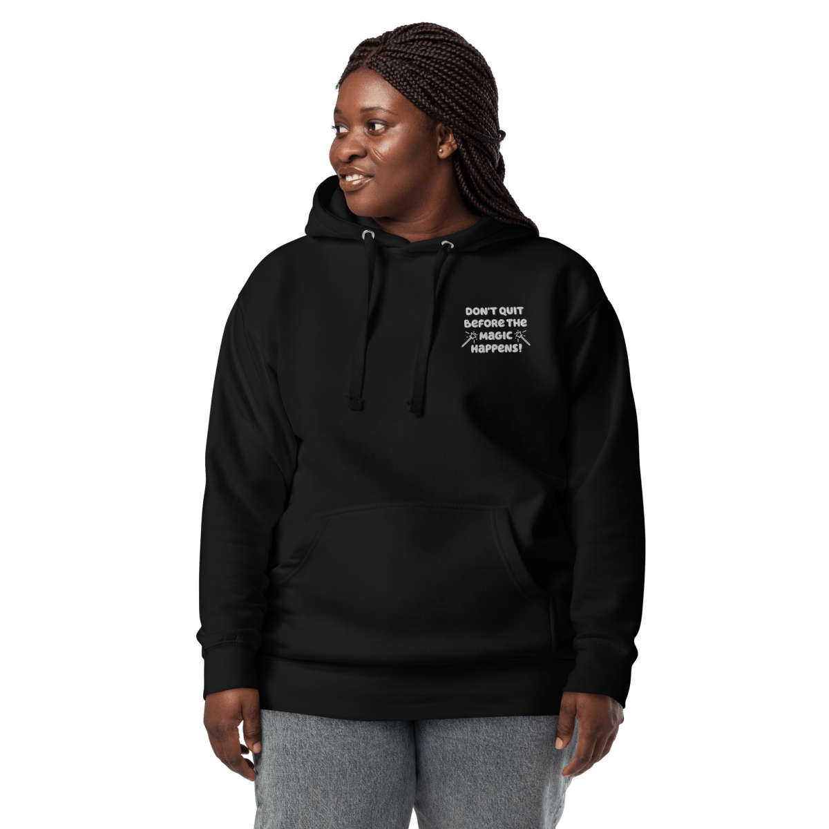 - Embroidered Hope Message – "Don't Quit Before the Magic Happens" embroidered on left chest celebrates persistence and transformation
