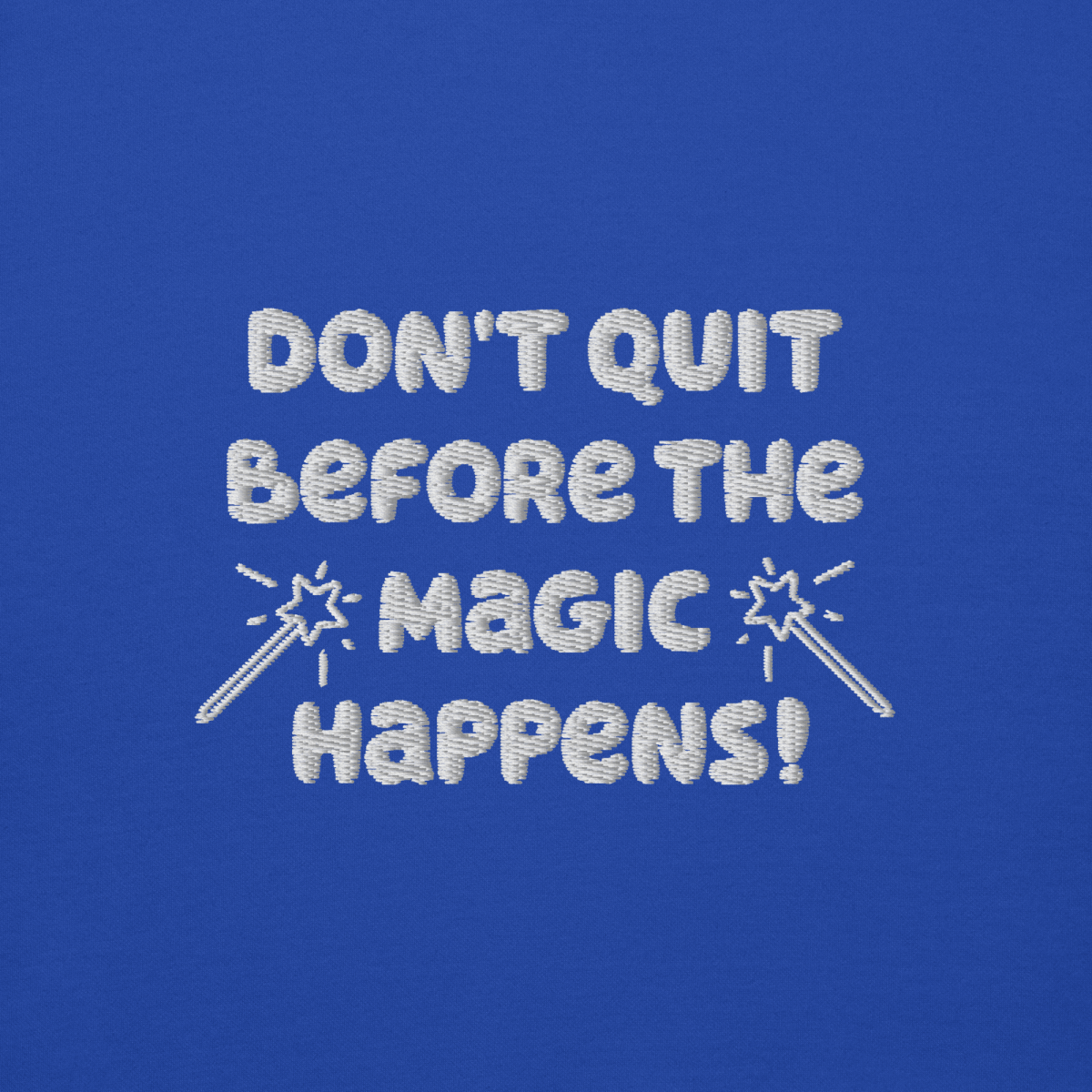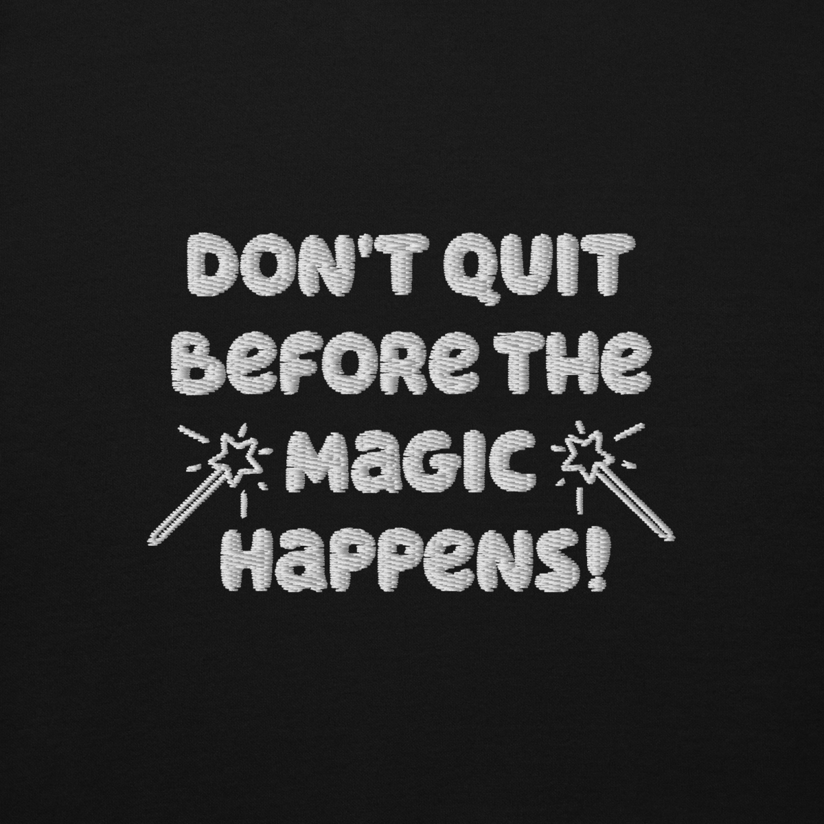 - "Don't Quit Before the Magic Happens" embroidered on left chest