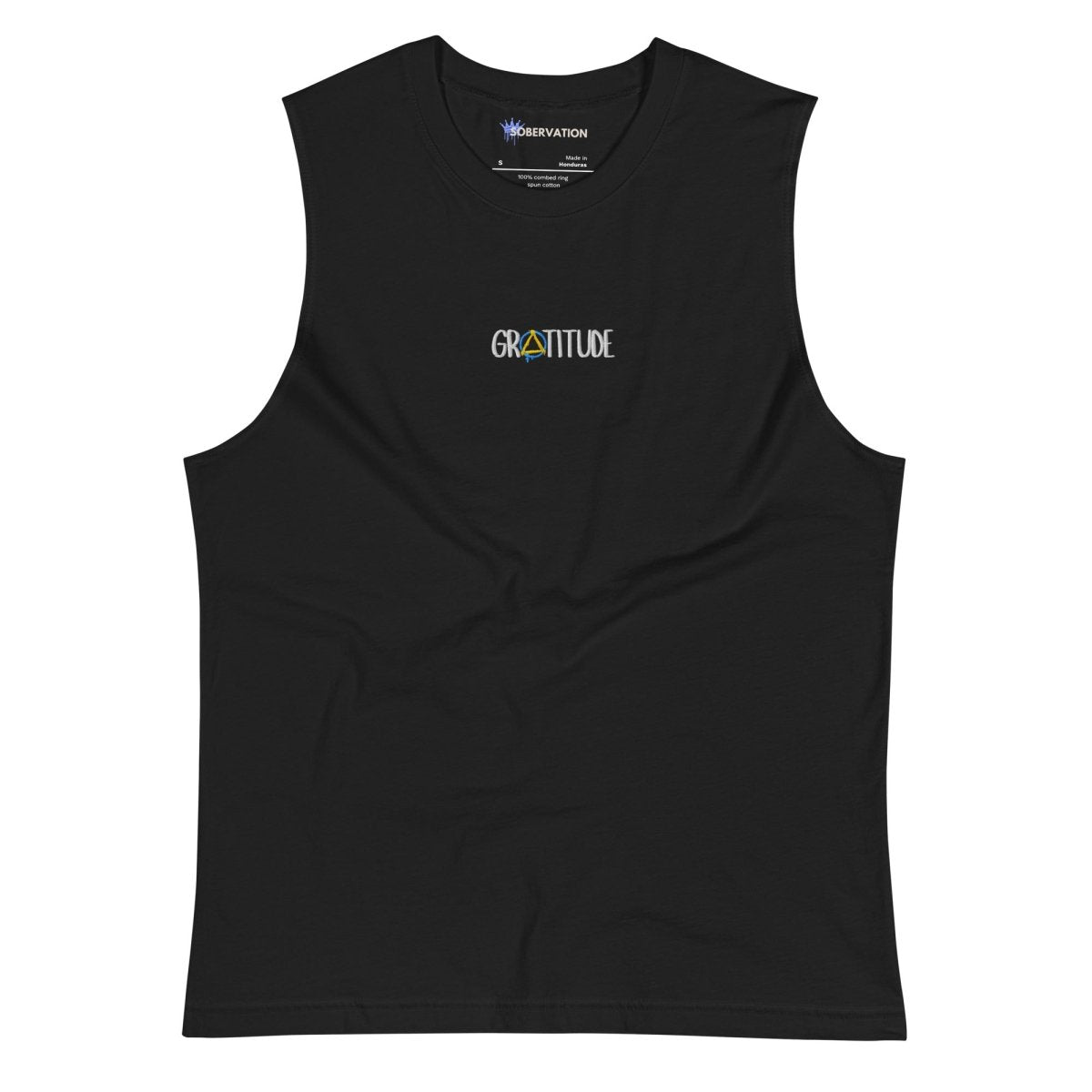 This isn't just a muscle shirt—it's a statement piece for those who understand that recovery is built one day, one choice, one moment of gratitude at a time. The word "Gratitude" is custom-embroidered on the center chest, with the iconic graffiti sobriety symbol replacing the "A"—a subtle nod to the community that gets it.