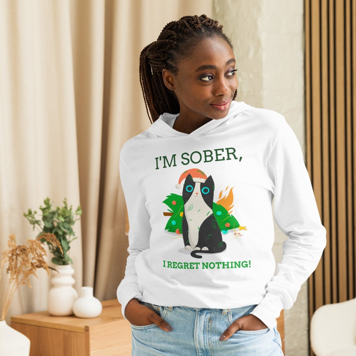 Stay cozy and empowered in the "I’m Sober & I Regret Nothing" hooded long sleeve tee. Perfect for layering, its lightweight, breathable fabric offers comfort and freedom of movement. Whether you're heading out or lounging, this tee reminds you to embrace your sober journey without regrets.