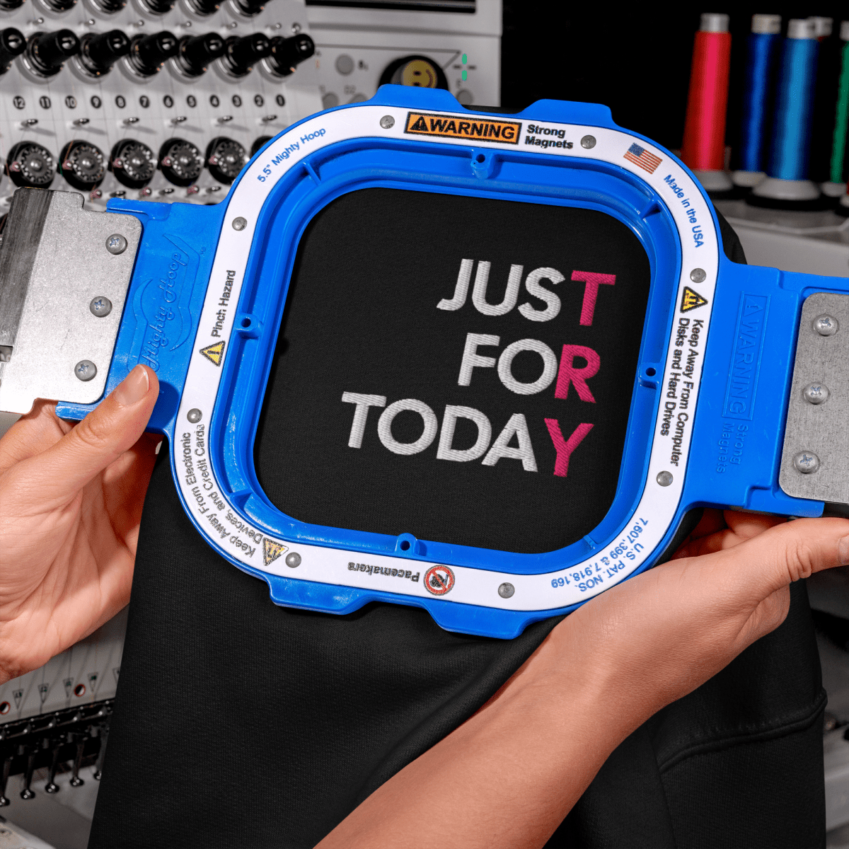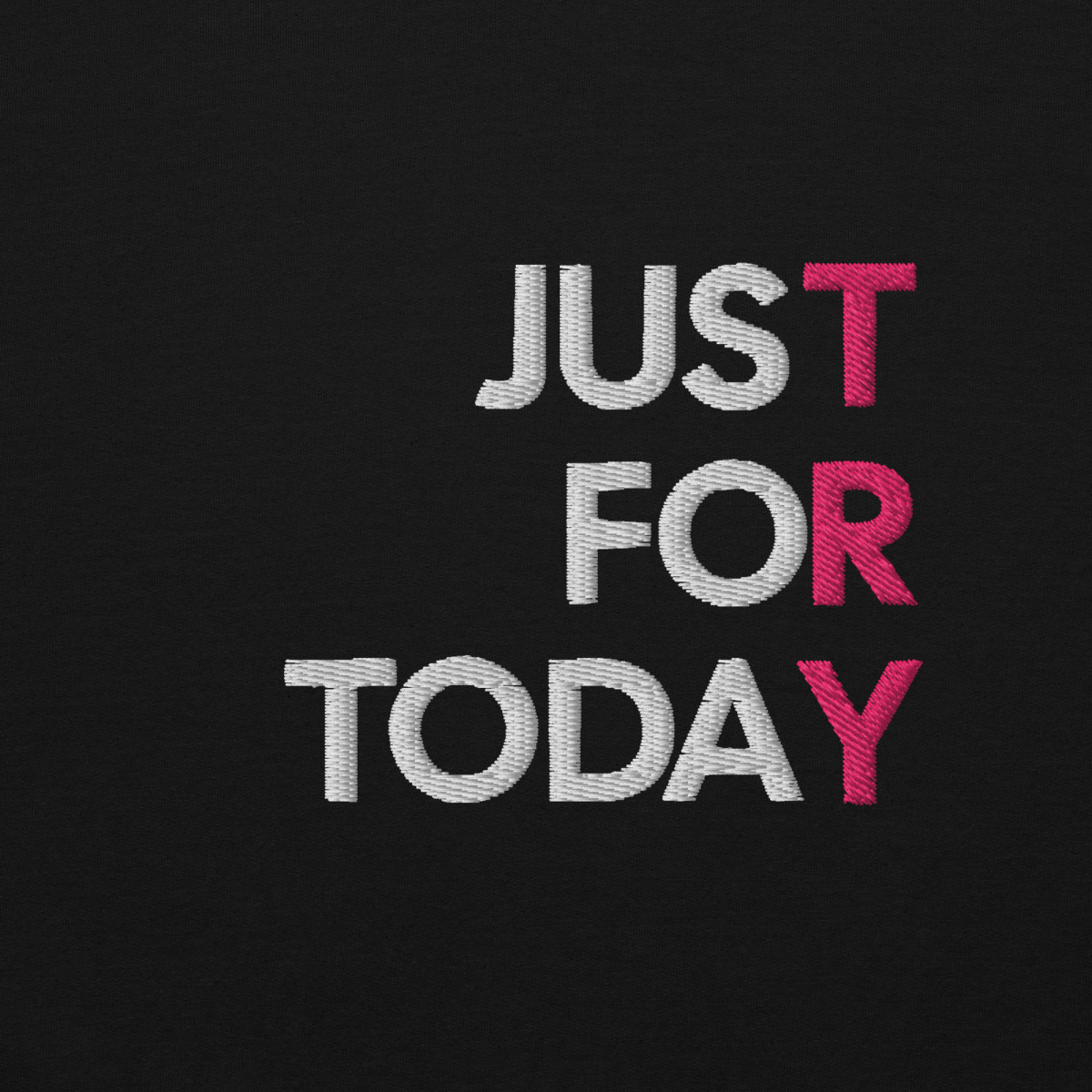 - "Just for Today" with "TRY" in pink embroidered on left chest