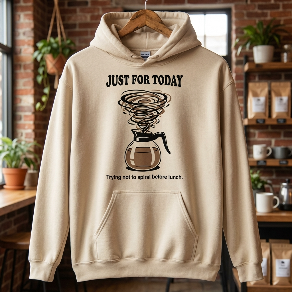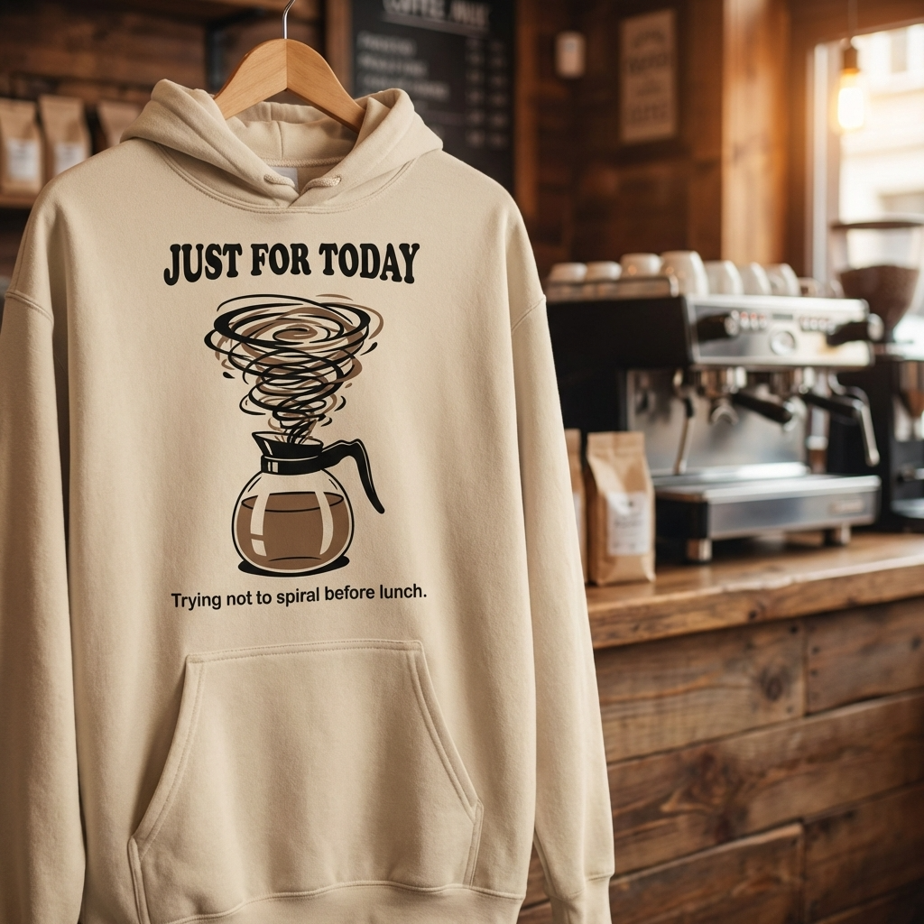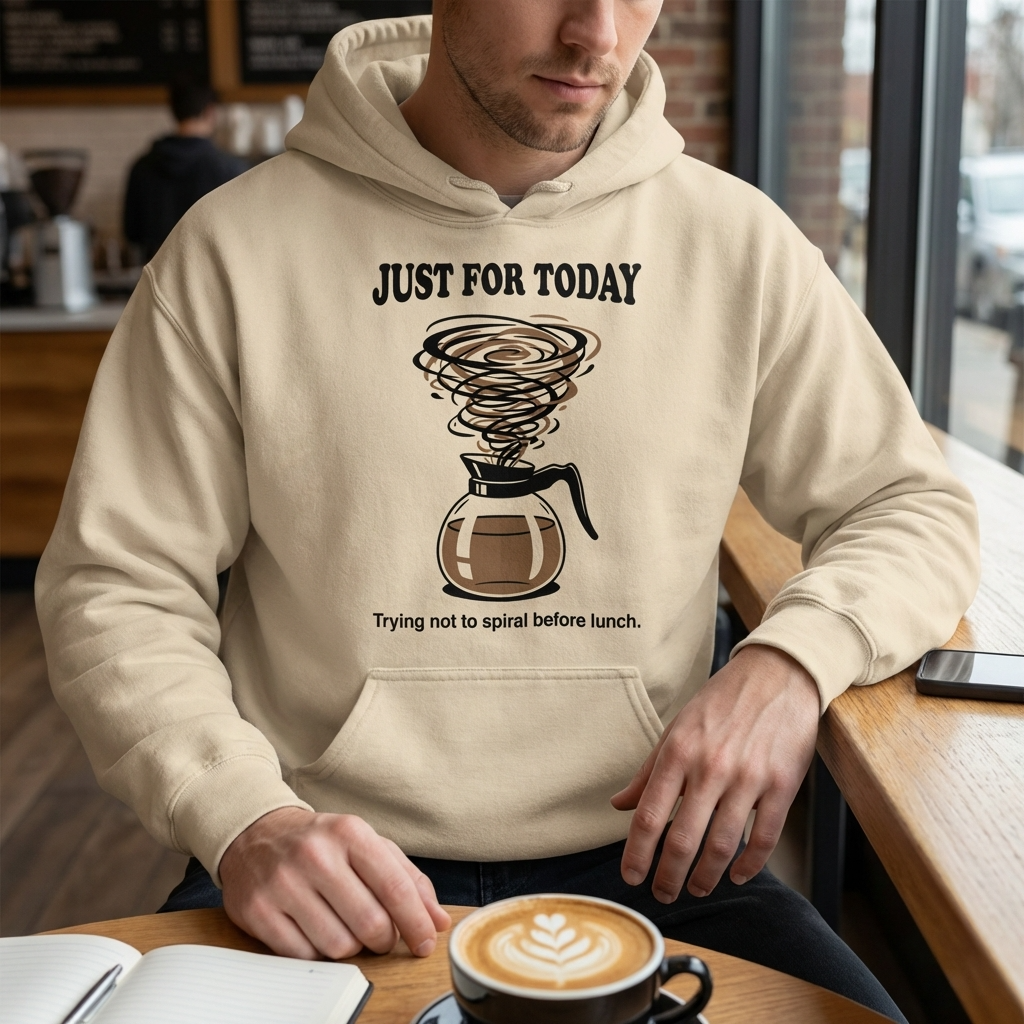 A coffee pot with swirling steam. Just For Today. Underneath: trying not to spiral before lunch. That’s the Sober Translations version of the most manageable commitment in recovery — the one that shrinks the whole thing down to a single day, a single morning, a single cup of coffee before the world gets loud.