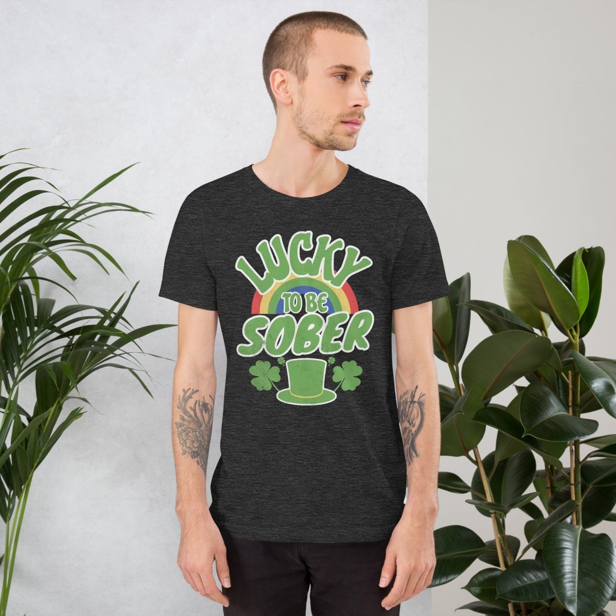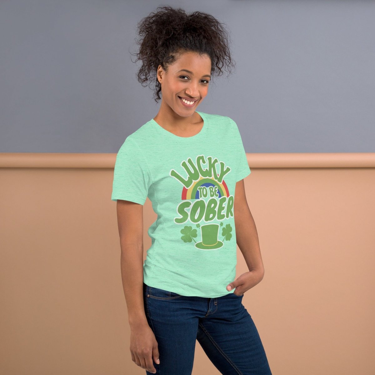 St. Patrick's Day doesn't have to mean drinking green beer. This tee celebrates the true luck—waking up clear-headed, present, and grateful on March 17th and every day after. The rainbow represents hope and possibility, the shamrocks symbolize good fortune, and "Lucky to be Sober" honors the greatest luck of all: choosing yourself and your recovery.