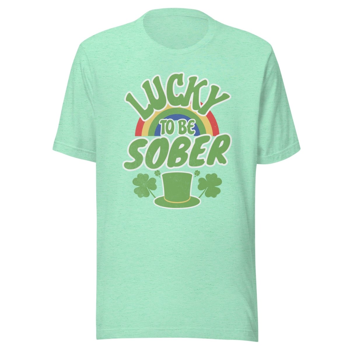 The Lucky to be Sober St. Patrick's Day Tee celebrates the luck of sobriety with festive Irish flair. Featuring a vibrant rainbow, traditional top hat, and lucky shamrocks with "Lucky to be Sober" messaging, this premium Bella + Canvas 3001 lightweight tee is perfect for celebrating St. Patrick's Day alcohol-free with pride, joy, and zero hangovers.