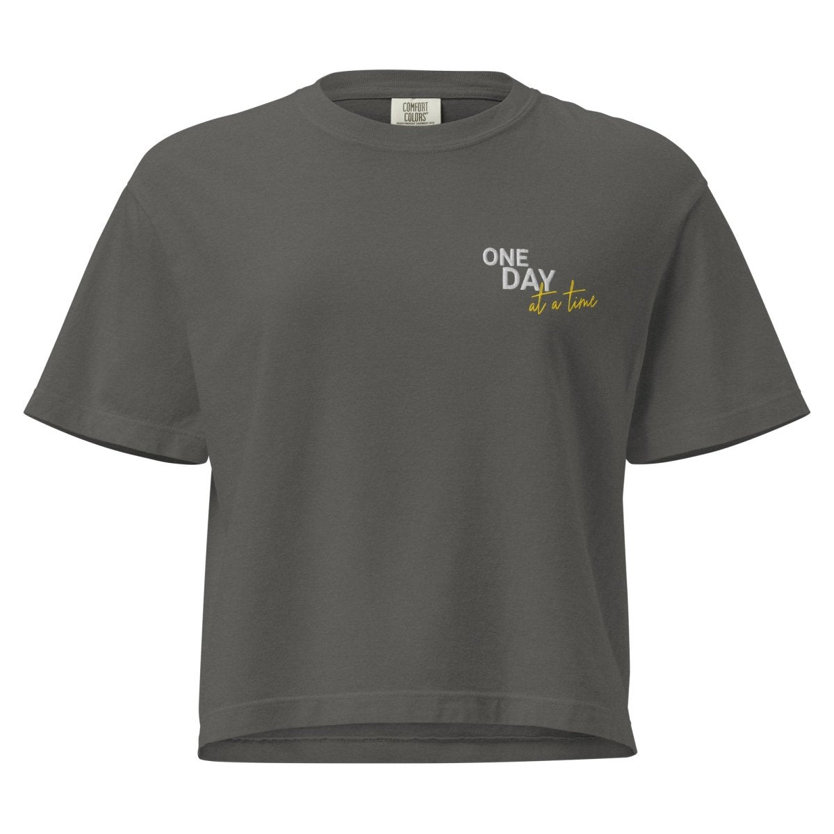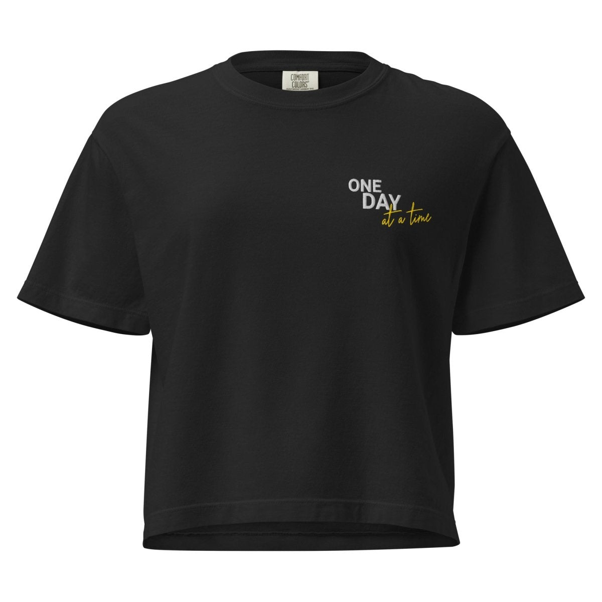 The One Day at a Time embroidery transforms this from basic apparel to a meaningful statement piece. Whether you're pairing it with high-waisted denim, layering it over a long-sleeve tee, or building your everyday recovery wardrobe, this boxy tee anchors any fit with presence and intention. It's a daily reminder that we don't have to conquer forever—we just have to show up, one day at a time.
