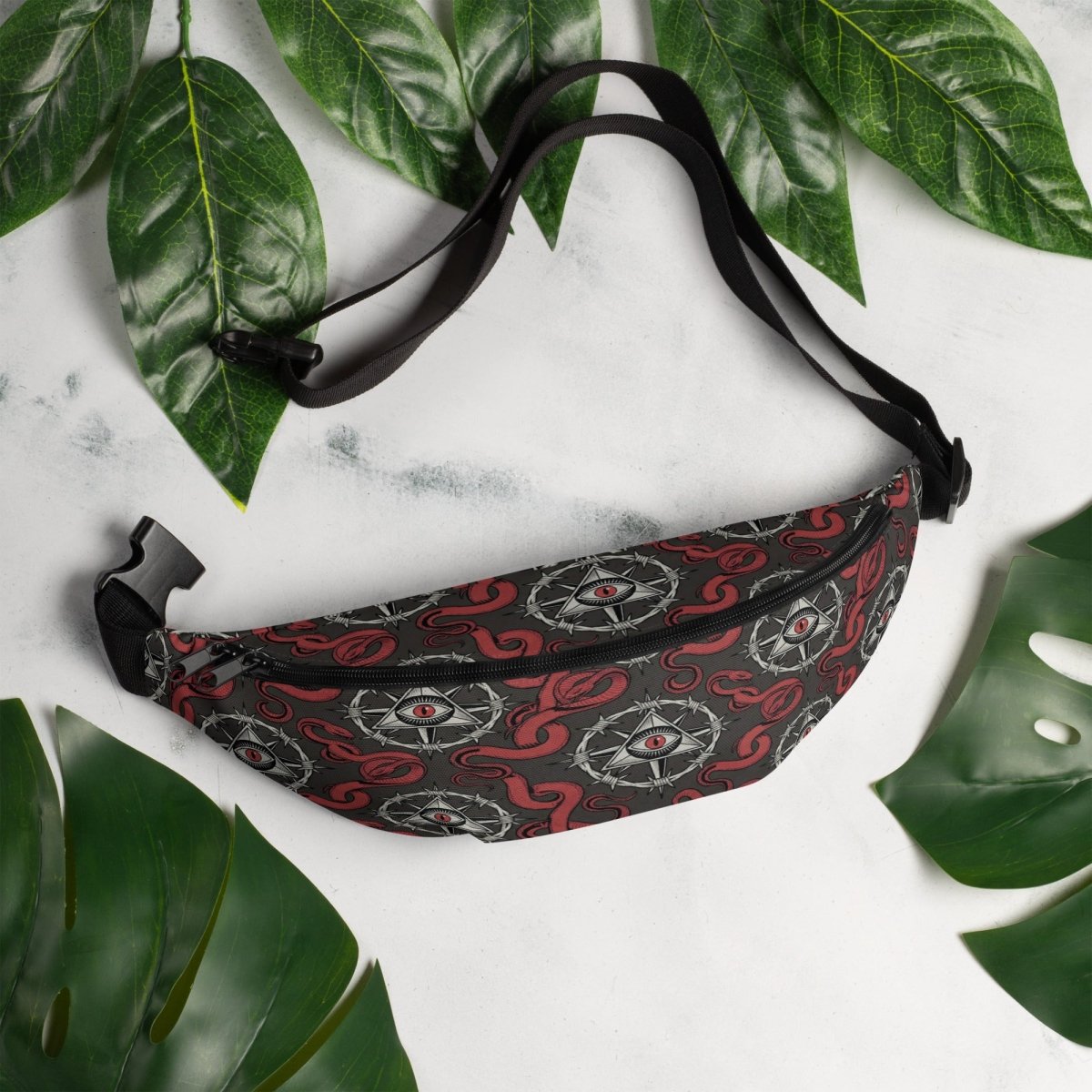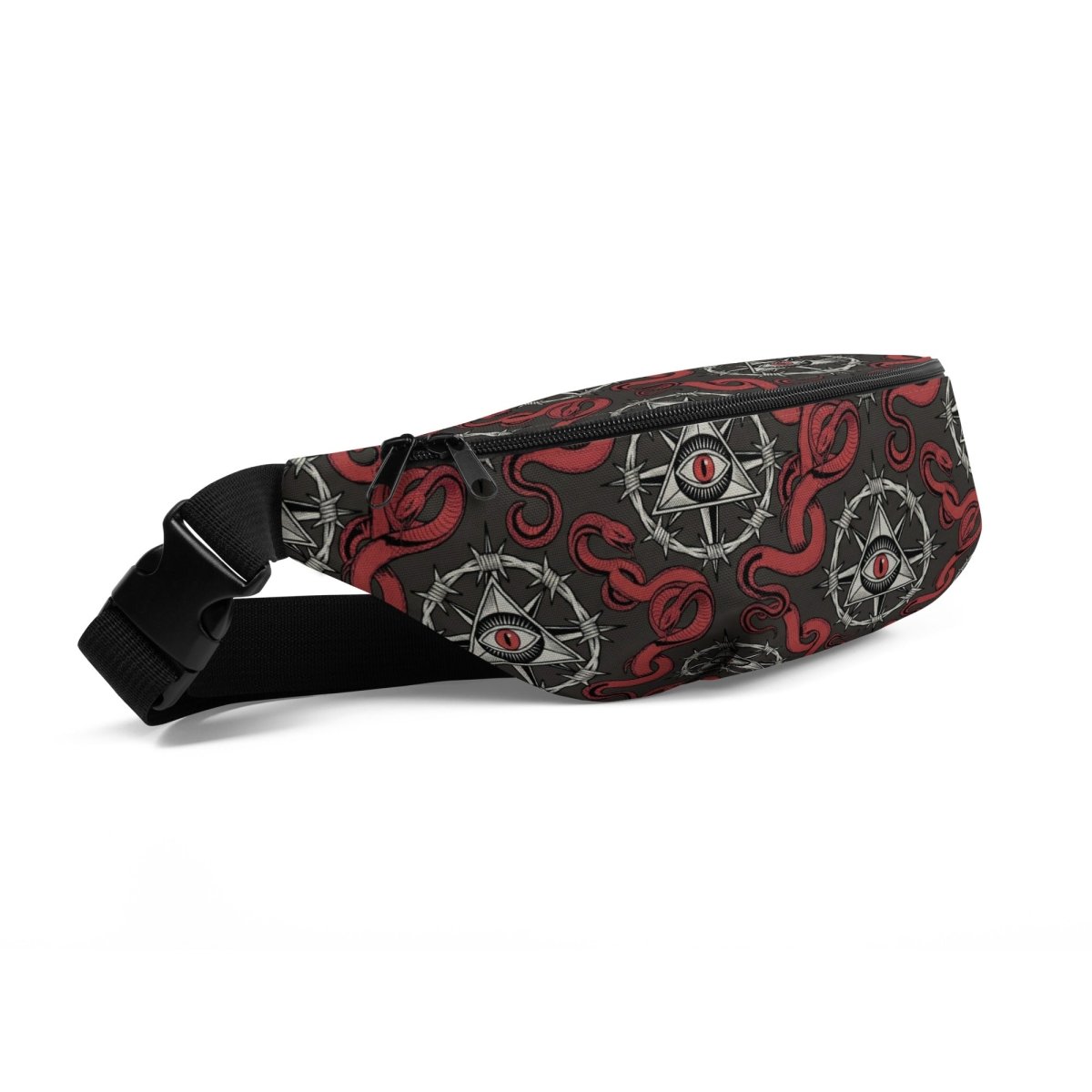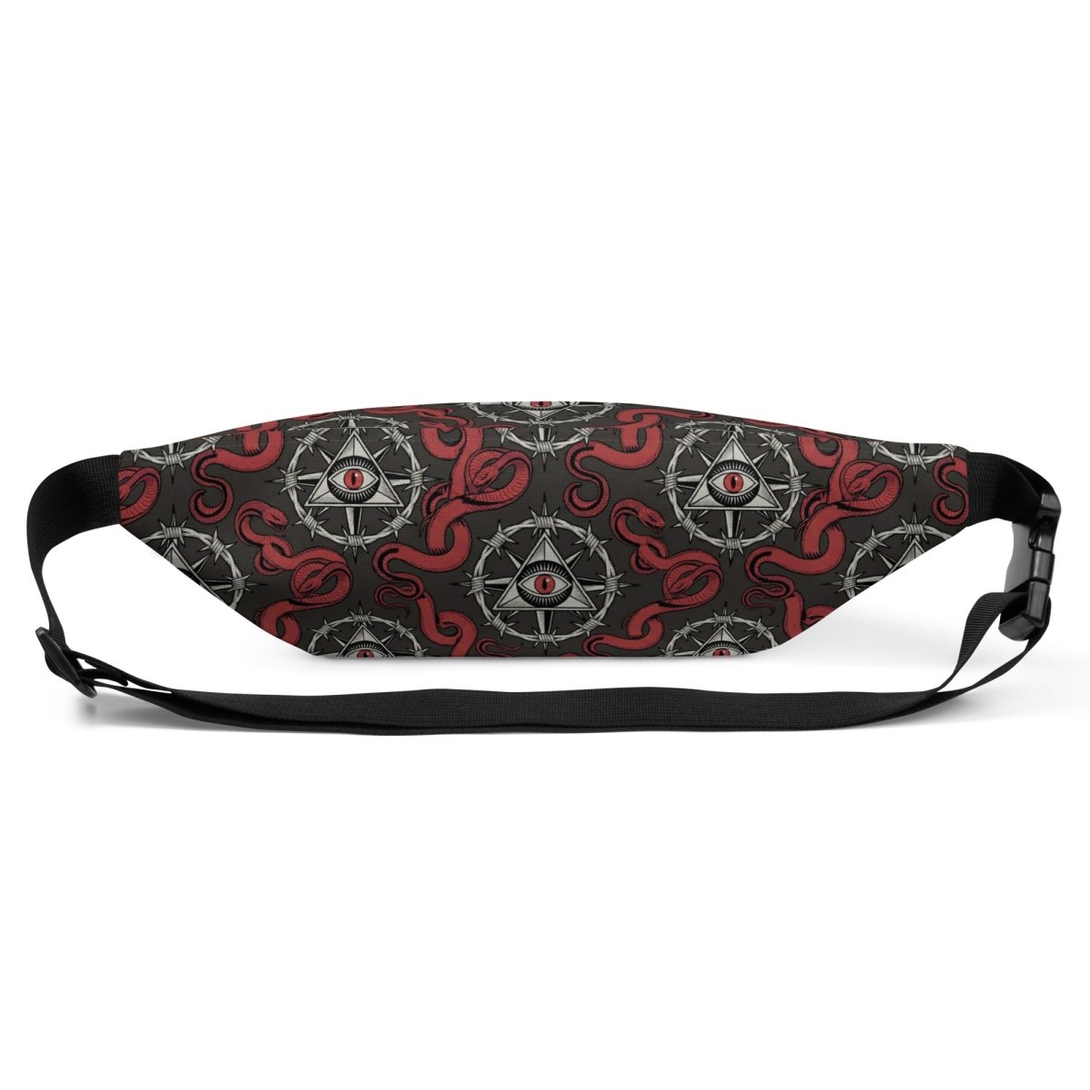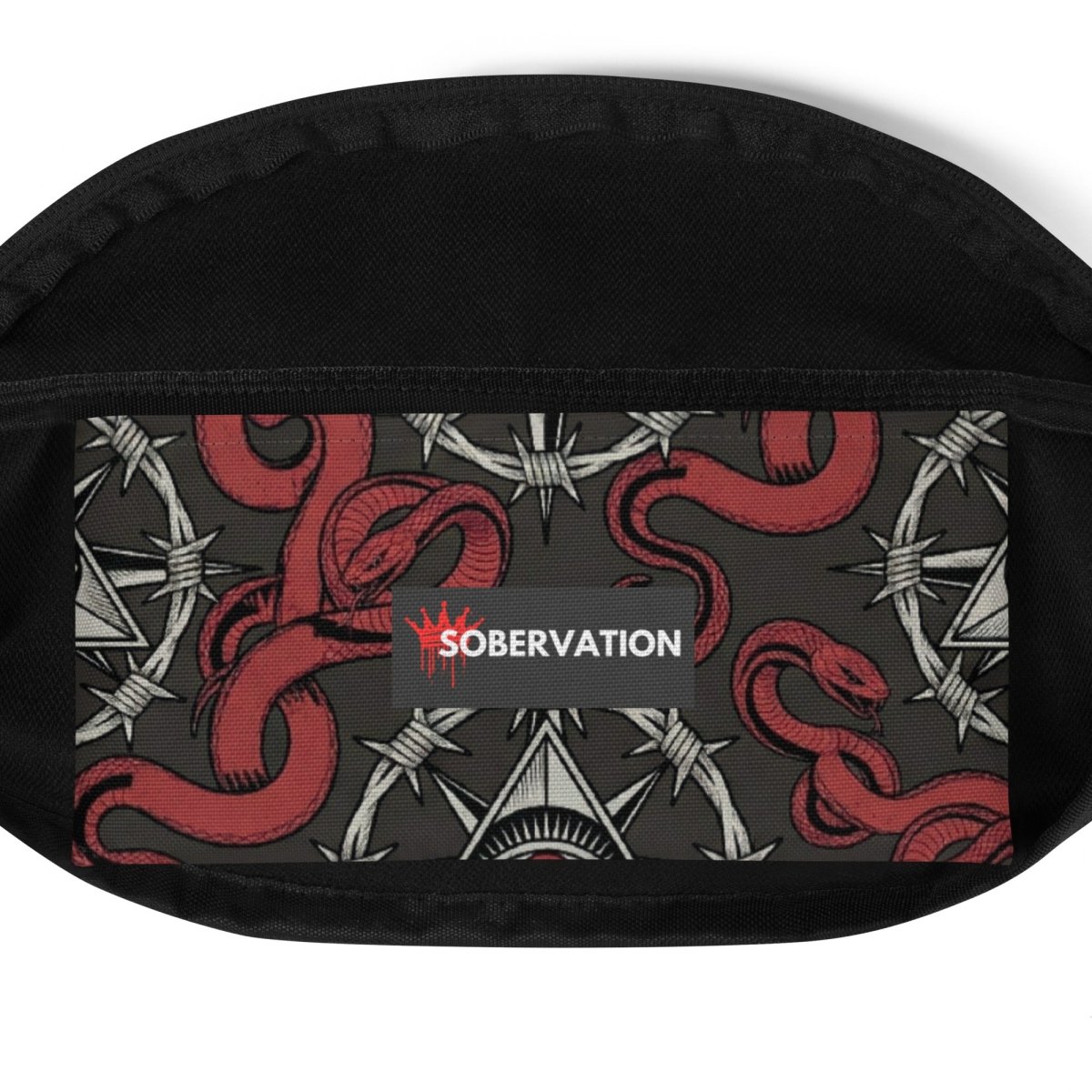 The Recovery Snake Fanny Pack keeps your essentials secure with powerful transformation symbolism. Featuring a repeating pattern of the sobriety symbol with barbed wire circle and all-seeing eye at center, surrounded by red snakes representing transformation and renewal—this premium fanny pack combines bold recovery messaging with hands-free convenience and durable construction.