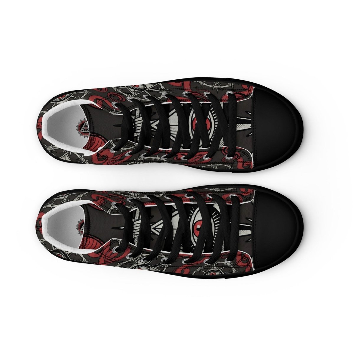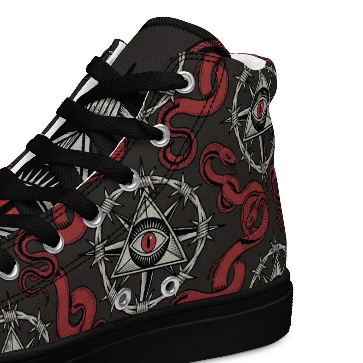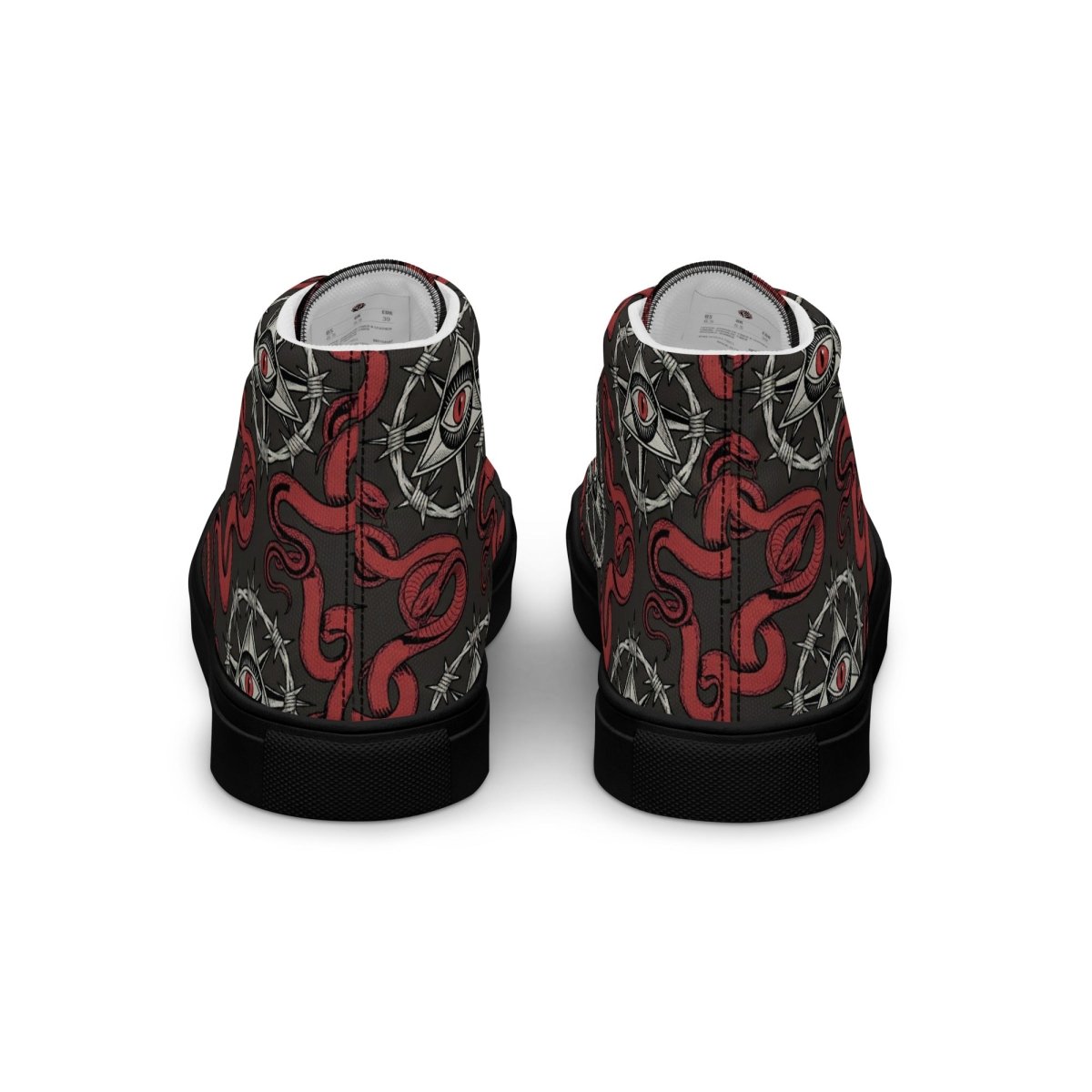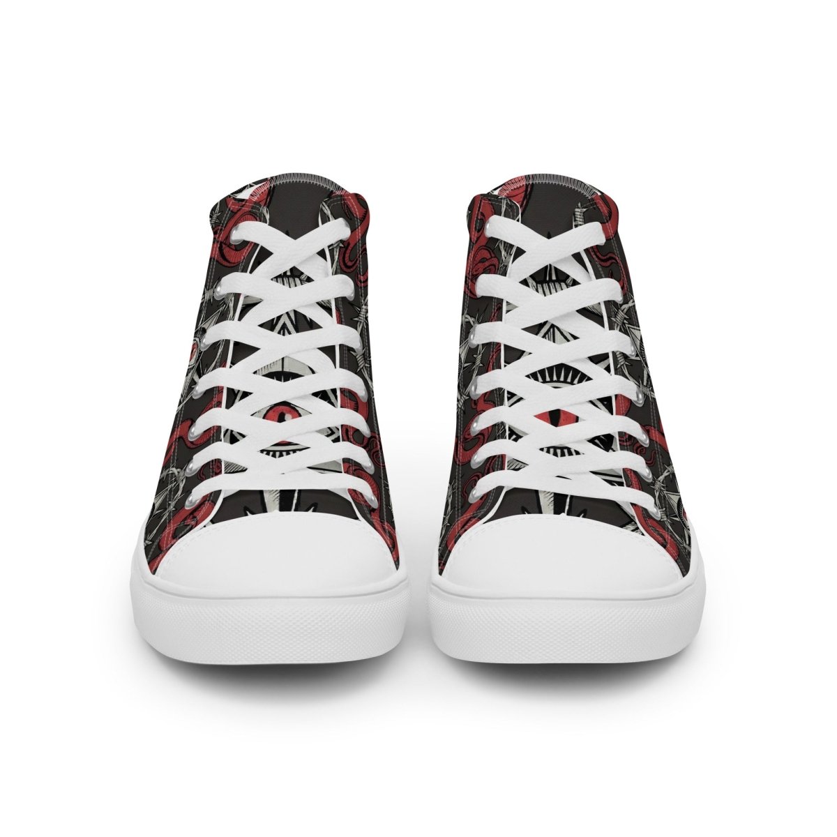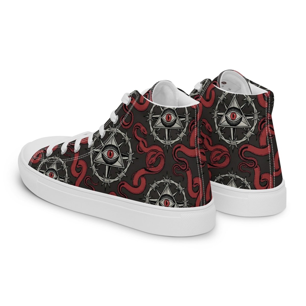 The Recovery Snake Men's High Top Canvas Shoes let you walk your recovery journey with powerful transformation symbolism. Featuring a repeating pattern of the sobriety symbol with barbed wire circle and all-seeing eye at center, surrounded by red snakes representing transformation and renewal—these premium high top canvas shoes combine bold recovery messaging with comfortable, stylish footwear.