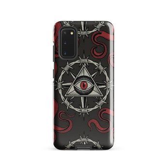 The Recovery Snake Samsung® Tough Case protects your phone with powerful transformation symbolism. Featuring a repeating pattern of the sobriety symbol with barbed wire circle and all-seeing eye at center, surrounded by red snakes representing transformation and renewal—this tough case combines bold recovery messaging with premium protection.