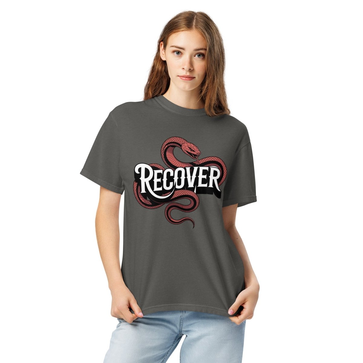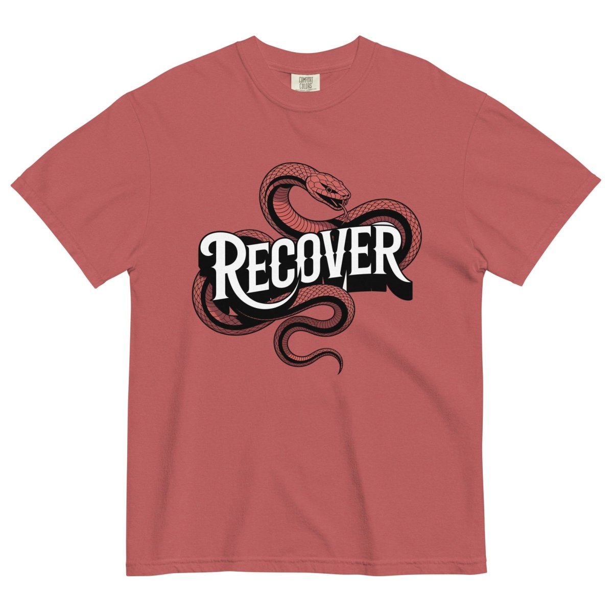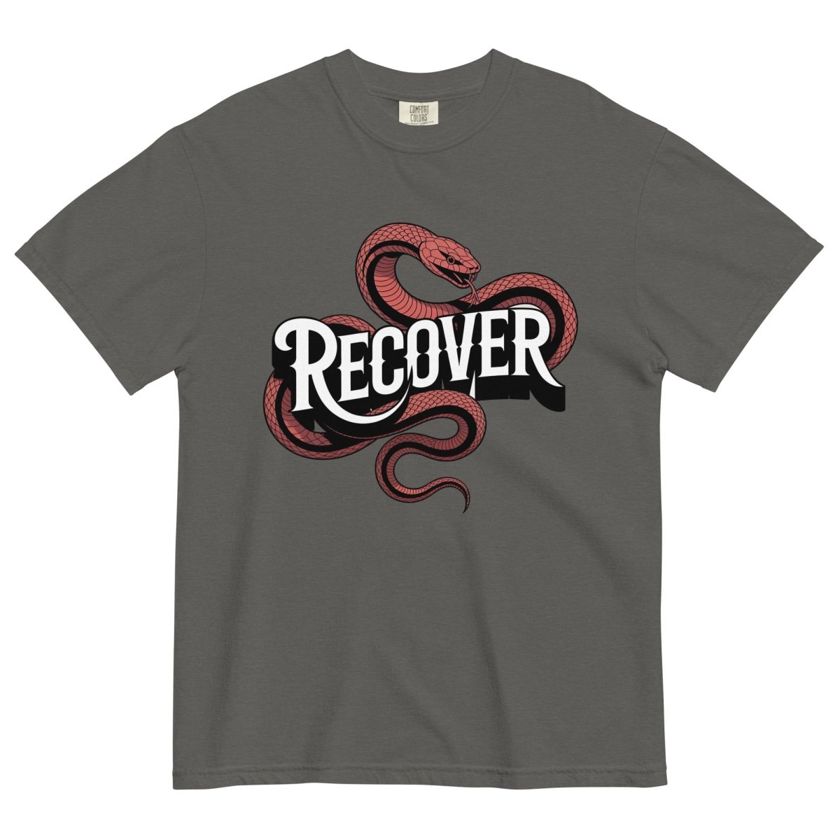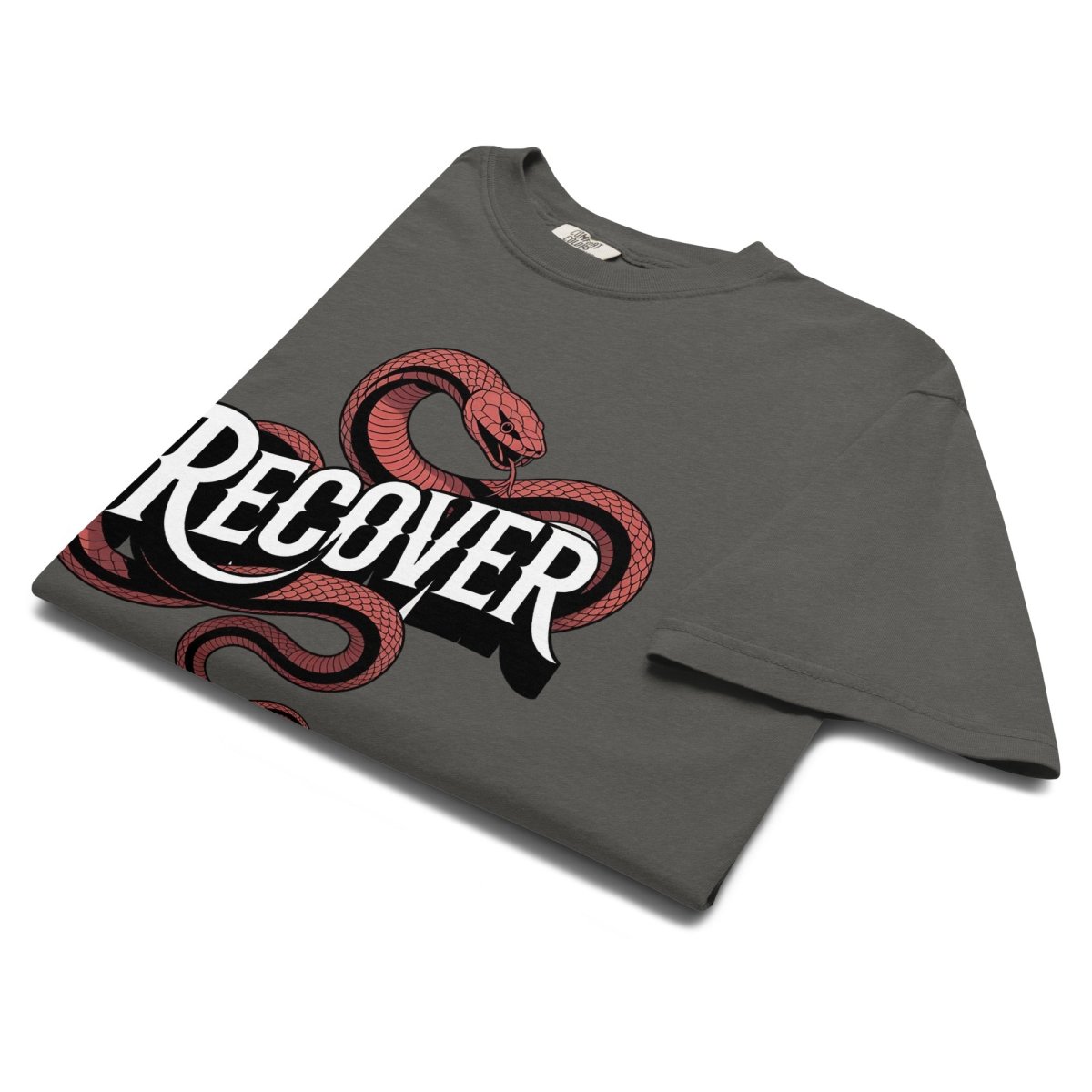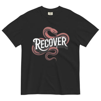 This design features a bold, coiled snake intertwined with the word RECOVERY, a visual reminder that transformation is not just possible—it's already happening.