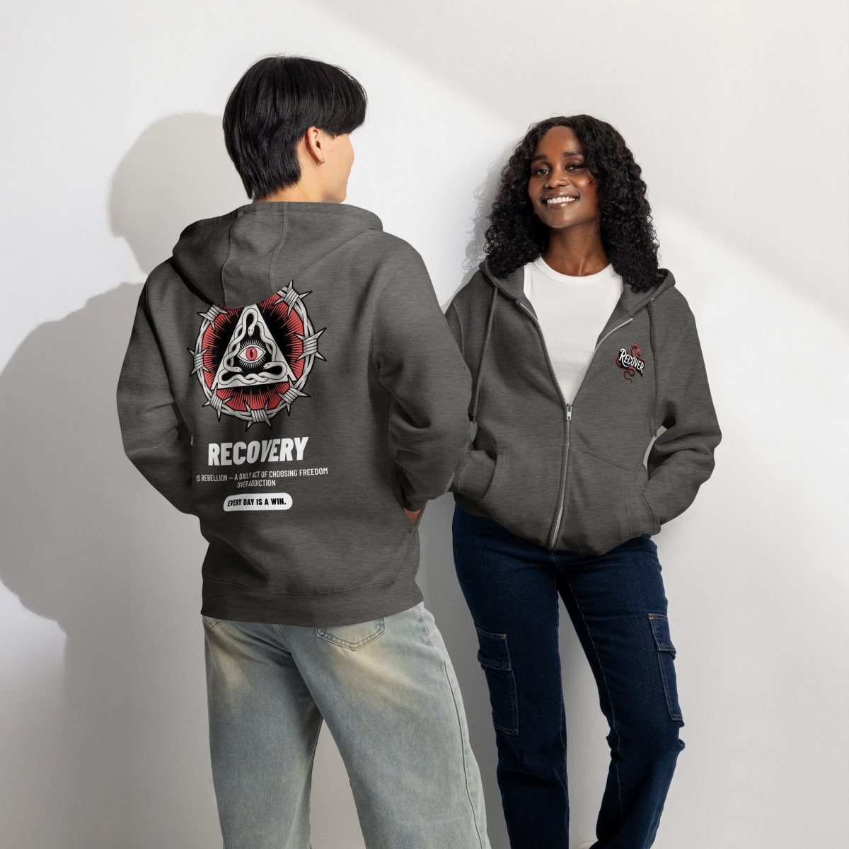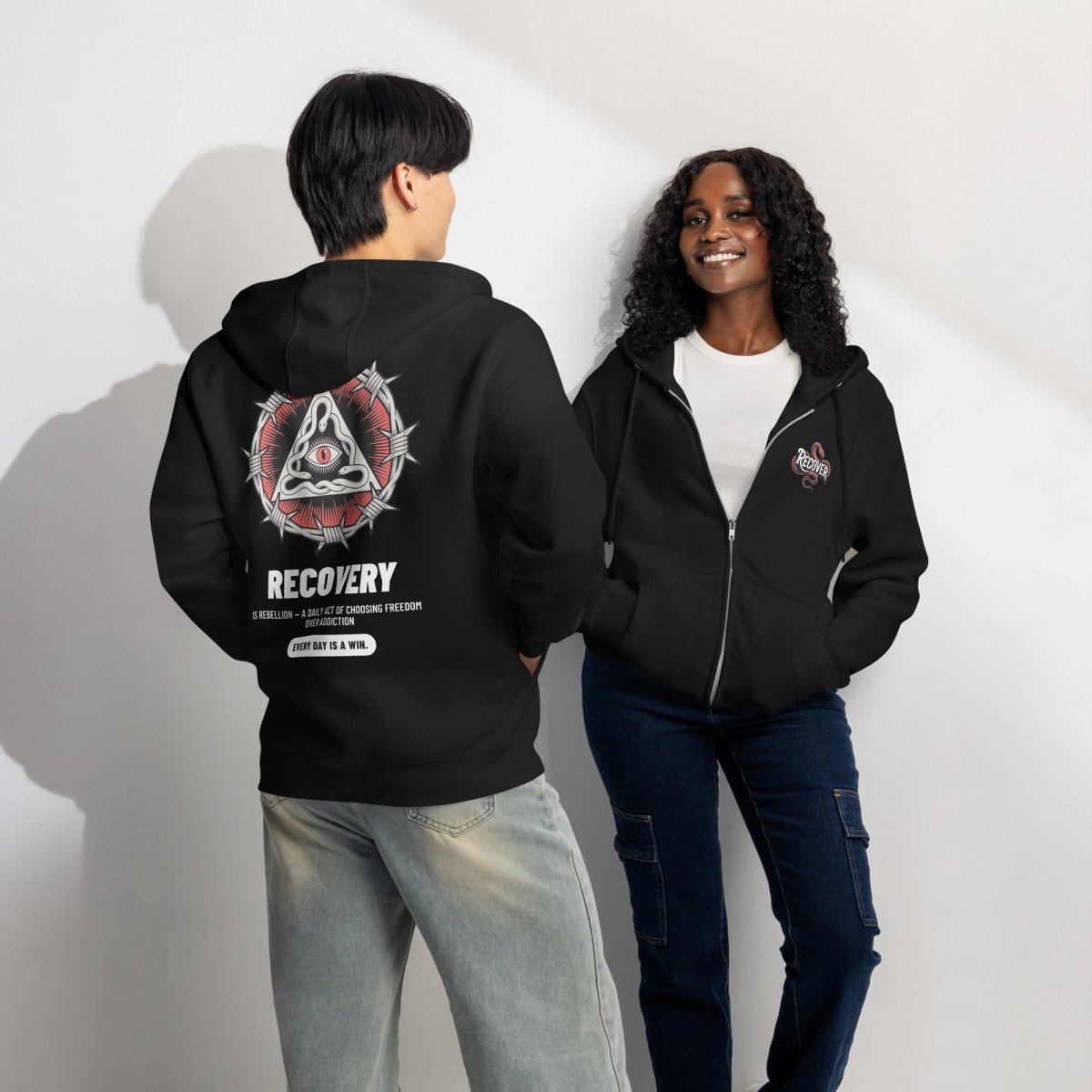 You're heading to a recovery meeting wearing your Recovery Snake zip hoodie. The midweight fleece feels substantial and warm. Someone notices the "Recover" snake graphic on your chest—subtle but striking. During the meeting, you turn around and they see the full back design—the barbed wire sobriety symbol, the dual snakes, the all-seeing eye, the powerful message about rebellion and freedom. After the meeting, they ask about it. You explain what it means—that recovery is your daily rebellion, that choosing freedom over addiction is the most powerful thing you do, that every day is a win. Your hoodie becomes more than apparel—it's armor, a conversation starter, and a declaration that you're choosing freedom.
