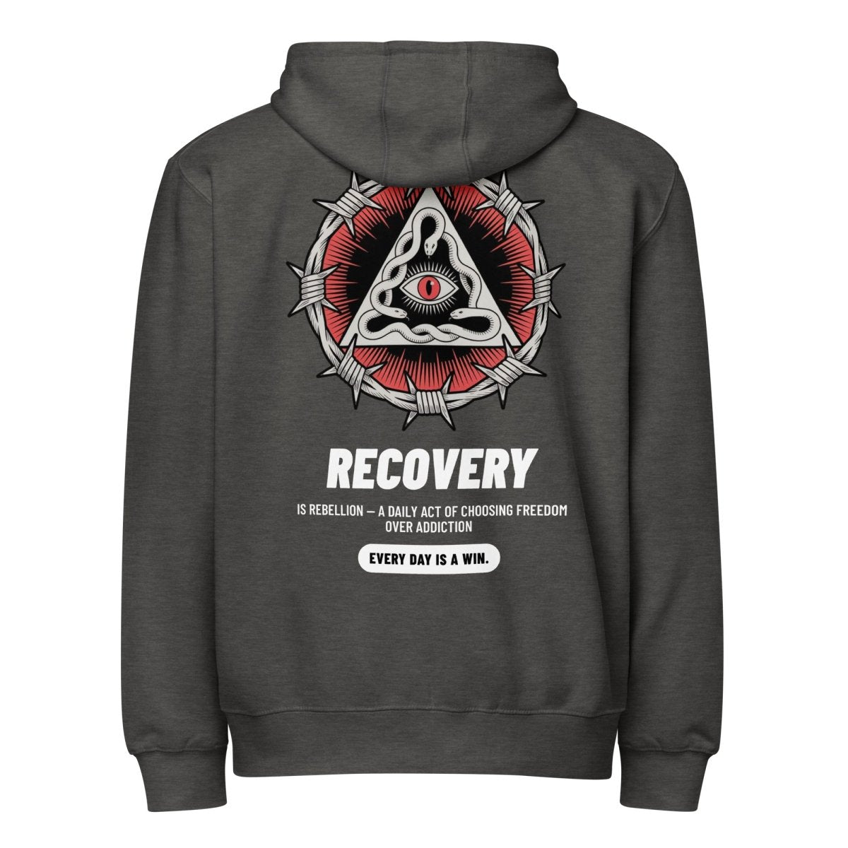 Recovery is rebellion. A daily act of choosing freedom over addiction. The front left chest features "Recover" paired with a striking snake—representing transformation, shedding old skin, and the rebirth that comes with sobriety. But it's the back that tells the full story: a reimagined sobriety symbol where barbed wire forms the circle (the barriers you've broken through), dual snakes create the triangle (transformation and renewal), and an all-seeing eye sits at the center (awareness and vigilance). Below it, the words that define the journey: "Recovery is rebellion, a daily act of choosing freedom over addiction. Every day is a win."