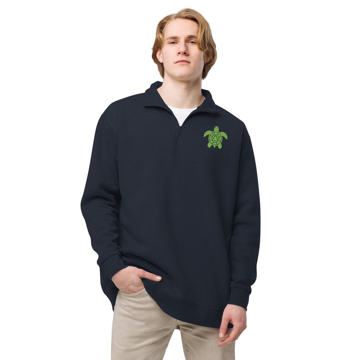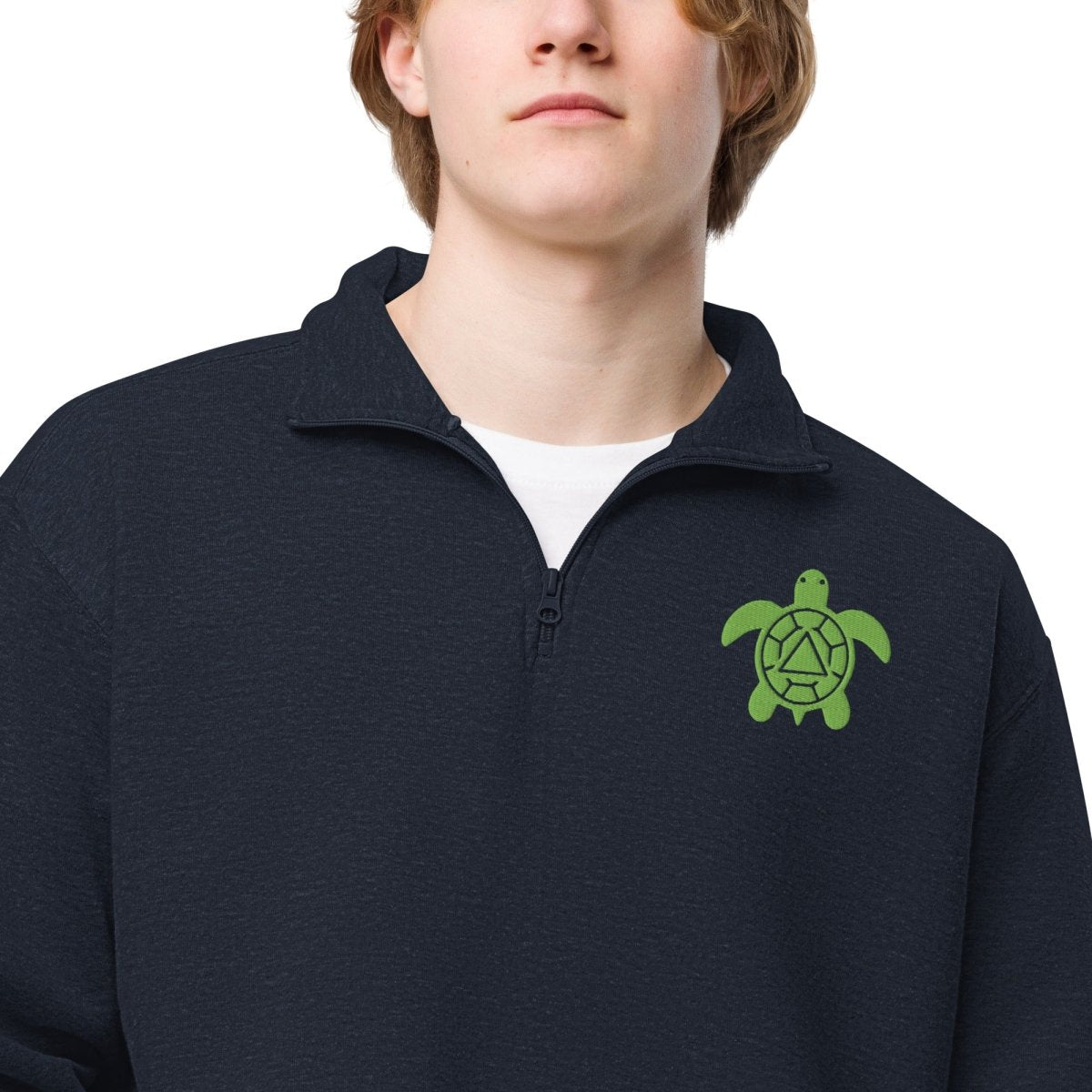 This isn't just a fleece pullover—it's a statement piece for those who understand that recovery is built one day, one choice, one steady step at a time. The recovery turtle is custom-embroidered—a turtle with the sobriety symbol inside its shell—a gentle reminder to the community that gets it: progress, not perfection.