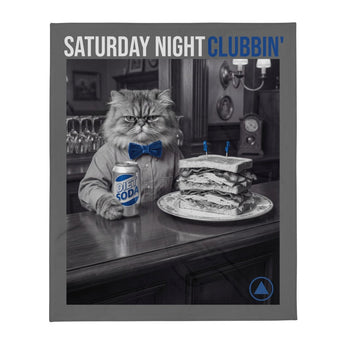 A throw blanket for Saturday nights that feel good the next morning. Featuring the iconic Saturday Night Clubbin' design from the Weekend Warriors collection—cat at a fancy bar with Diet Pepsi and club sandwich, sobriety symbol in the corner—this soft silk-touch blanket brings warmth and intention to your space.