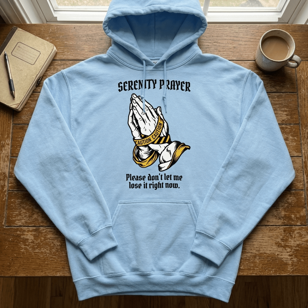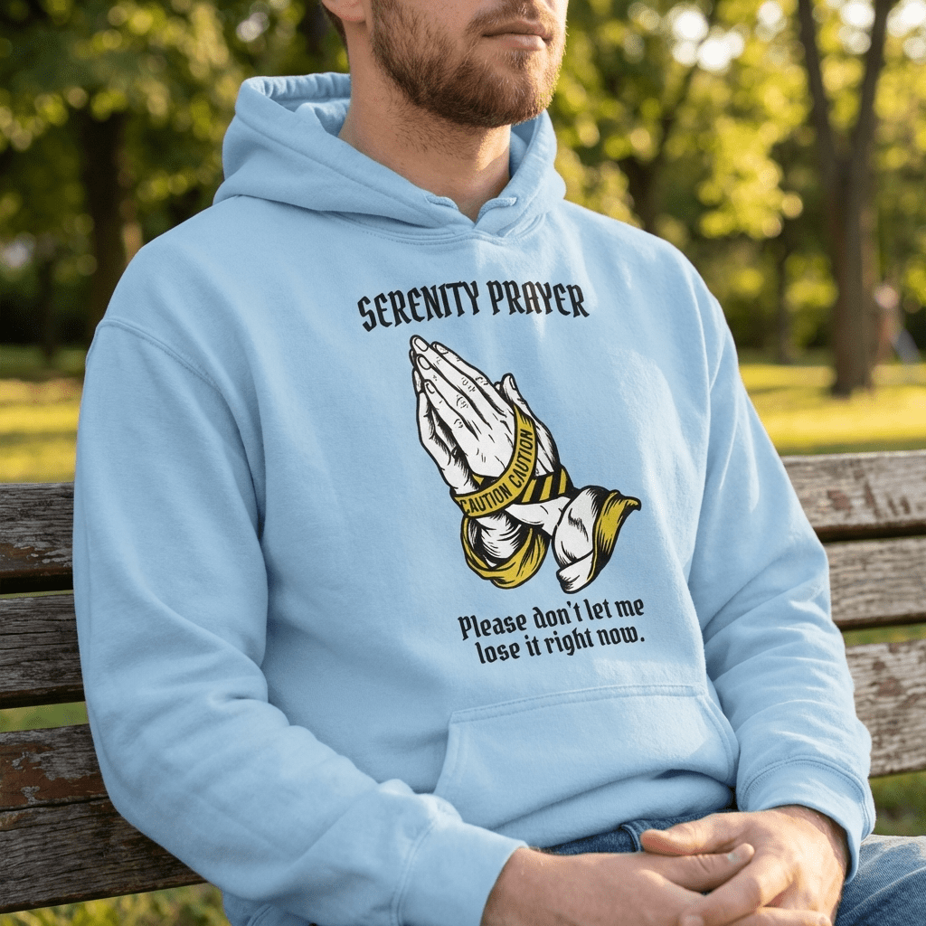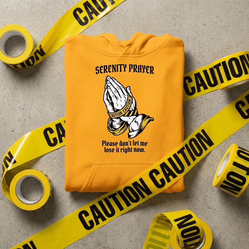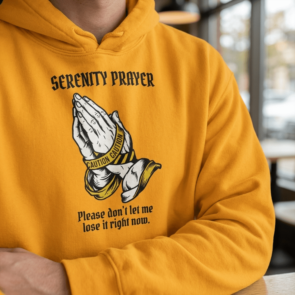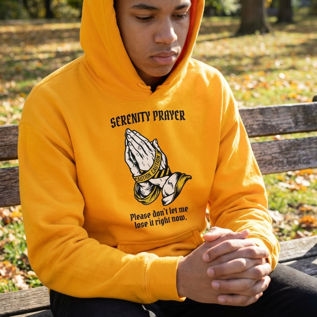 A heavyweight Gildan hoodie in Gold and Light Blue — warmth and luminosity, calm and clarity. The two colorways that carry the Serenity Prayer’s energy best: gold for the courage, light blue for the serenity.