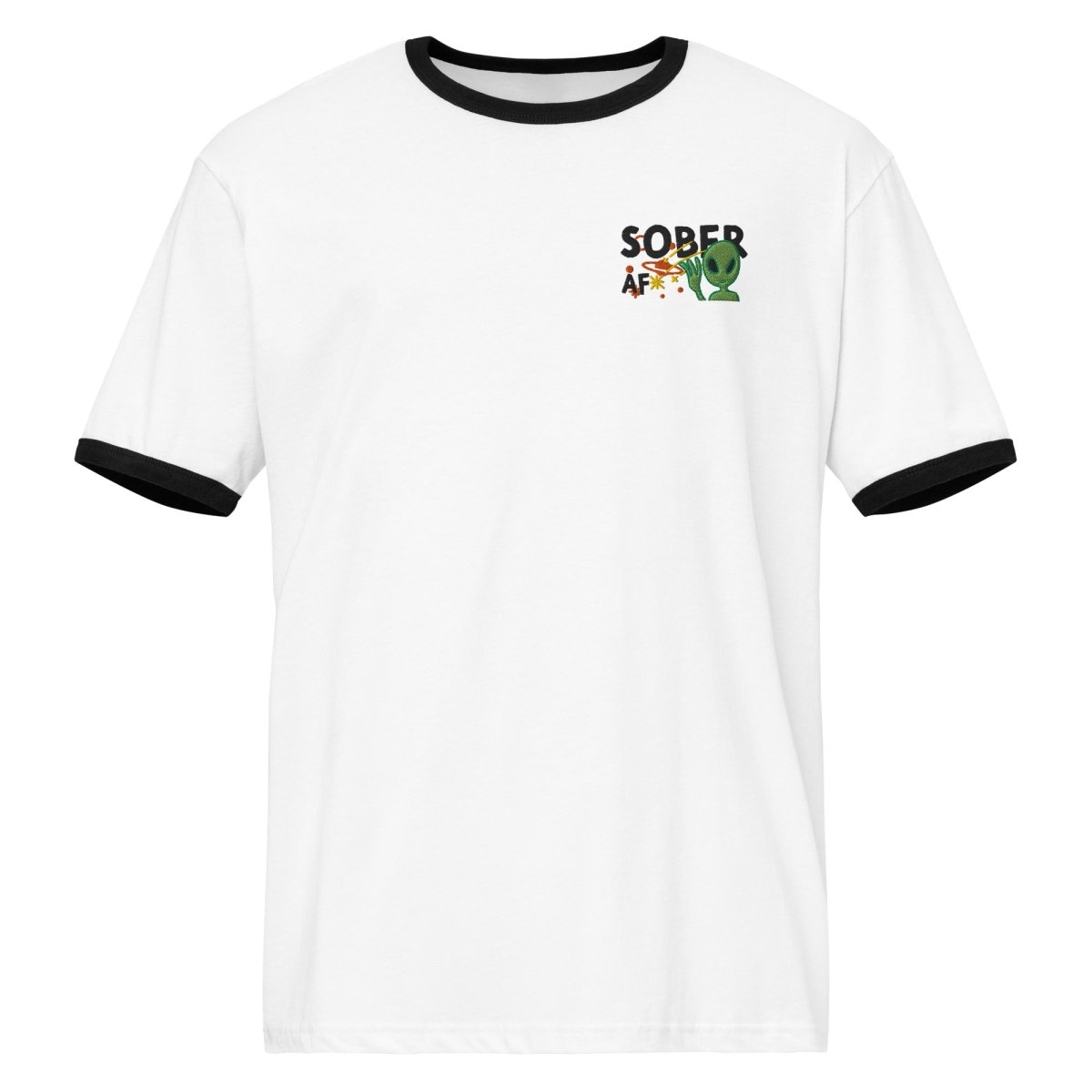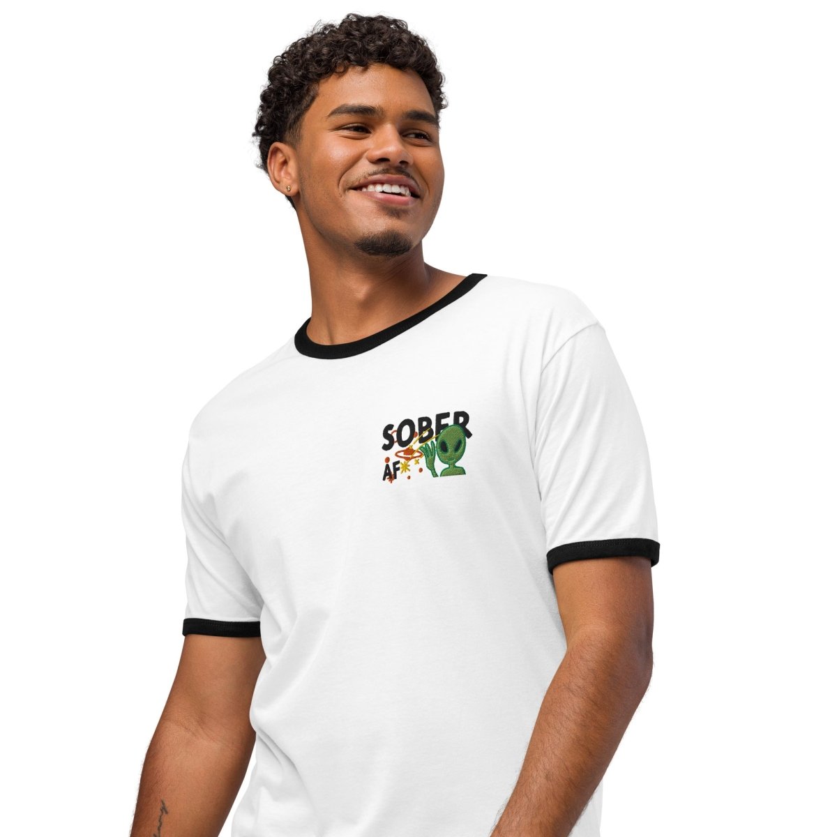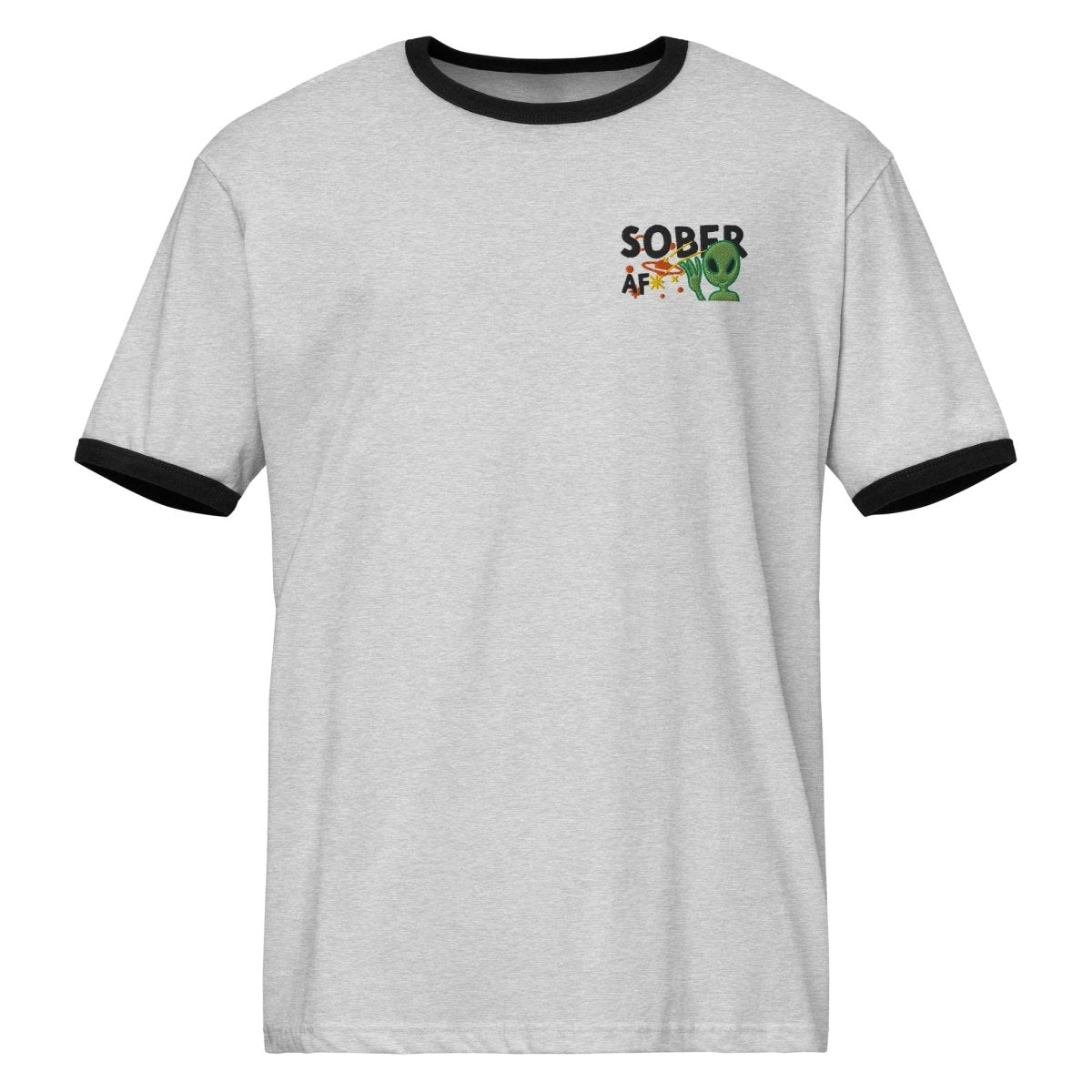 Ringer tees carry vintage athletic energy. The contrast trim at the neckline and sleeves creates a retro aesthetic that pairs perfectly with the cosmic recovery theme. This embroidered design features "SOBER AF" with an alien and planetary imagery, bringing galactic sobriety into classic territory where nostalgia meets contemporary recovery messaging. The center chest placement positions the design where it commands attention while the ringer details frame it naturally.