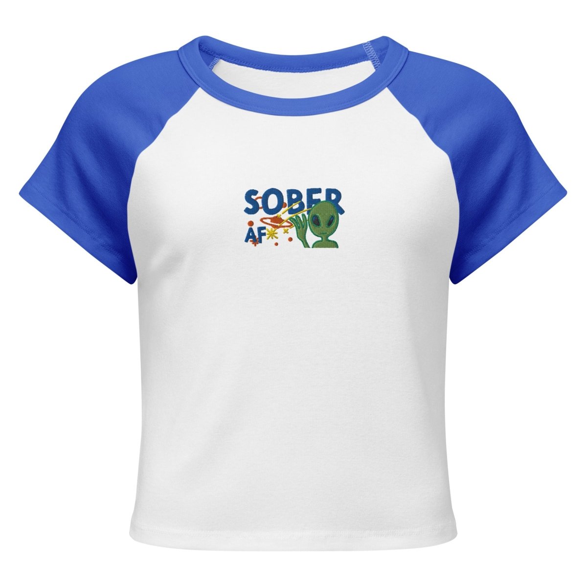 Galactic sobriety takes recovery beyond Earth. This embroidered design features "SOBER AF" paired with an alien and planetary imagery, transforming the recovery message into cosmic territory. The center chest placement positions the design where it commands attention, turning the fitted baby tee into a statement piece that balances playful extraterrestrial aesthetics with genuine commitment to sobriety.