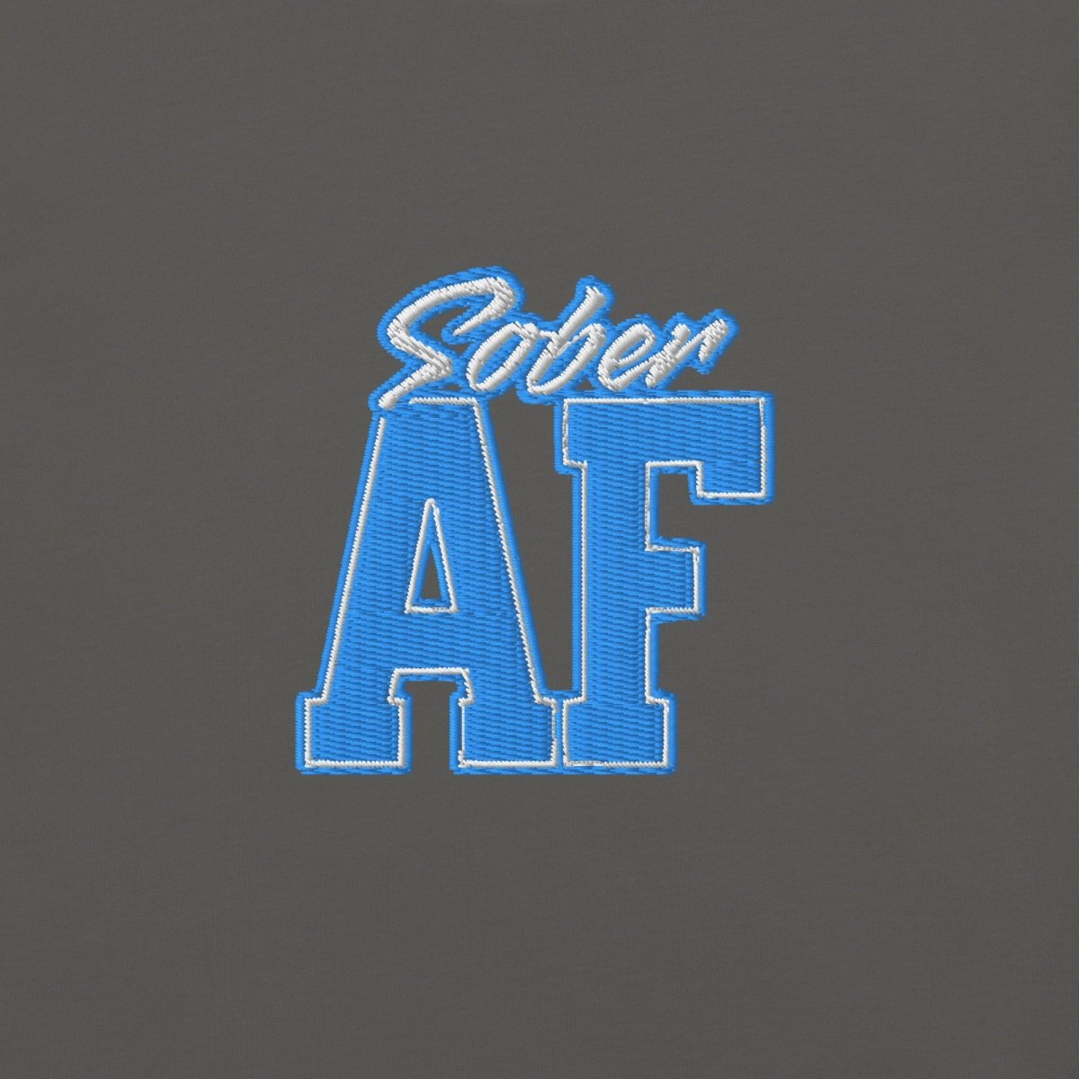 SOBER AF embroidered on the left chest—bold collegiate style meets premium garment-dyed comfort.