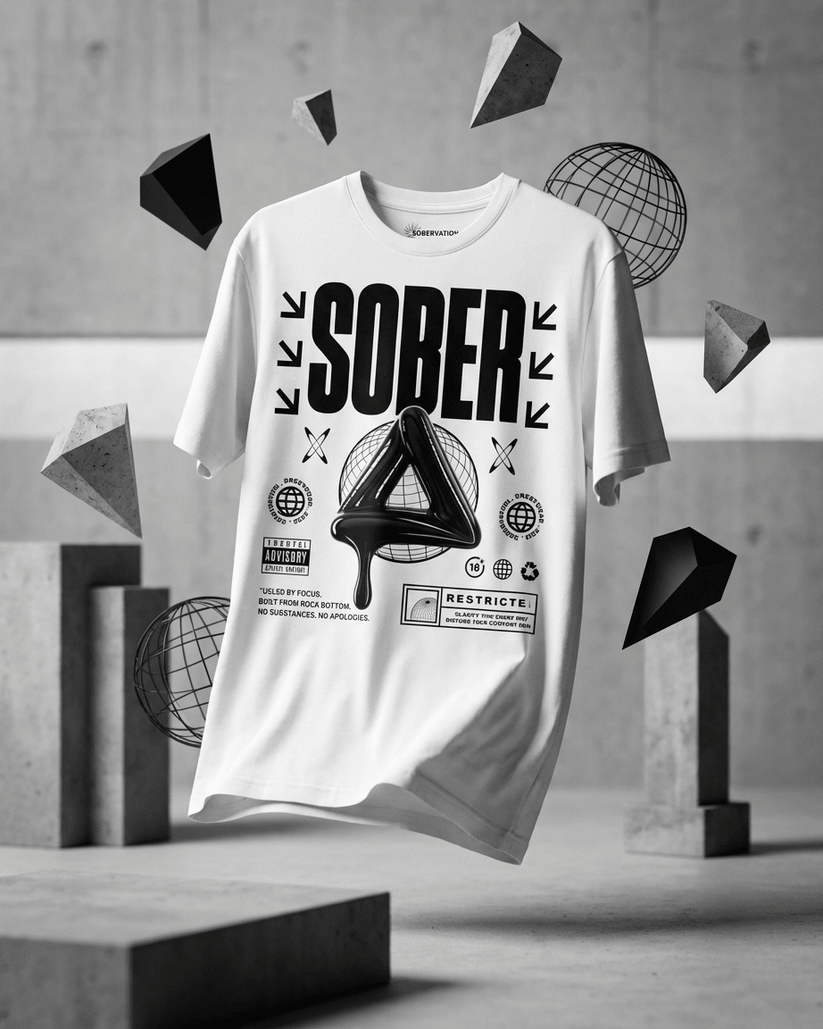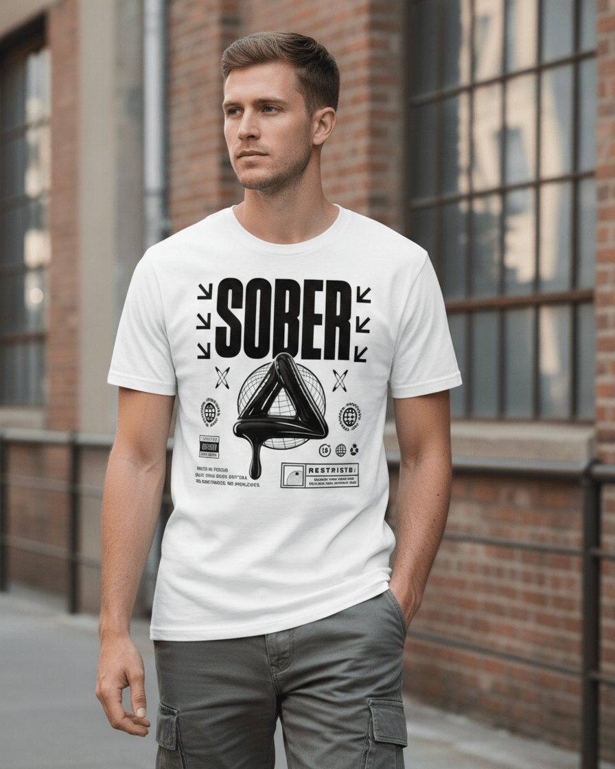 You're walking into a recovery meeting wearing your SOBER Black Label tee. The bold design catches eyes immediately—the melting sobriety symbol, the stark typography, the unapologetic phrases. Someone reads "Fueled by focus. Built from rock bottom" and nods knowingly. They get it. Later at the coffee shop, someone asks about your shirt. You explain what it means—that you're sober, that you're proud, that clarity this sharp does disturb comfort zones. The music label aesthetic resonates—people recognize the style even if they don't know the recovery symbolism. Your tee becomes more than apparel—it's a conversation starter, a badge of honor, and a declaration that sobriety is your lifestyle.