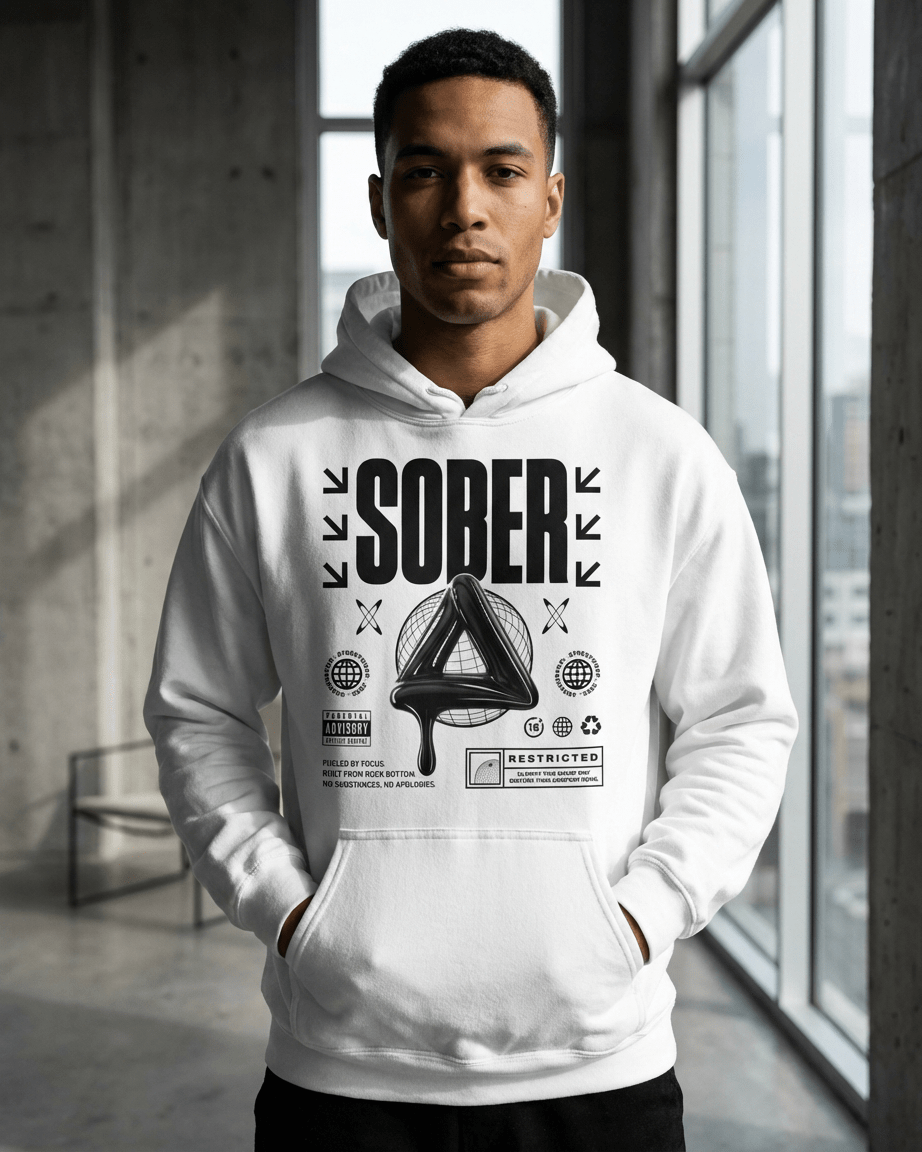 The SOBER Black Label Hoodie makes a bold, unapologetic statement about your sobriety. Featuring the full melting, dripping sobriety symbol design on the front with "SOBER" in bold typography styled like a music label parental advisory, plus powerful recovery phrases—this Gildan 18500 hoodie combines streetwear edge with recovery pride and cozy warmth. One of our best-selling recovery pieces, loved by the community for its bold messaging and everyday comfort.
