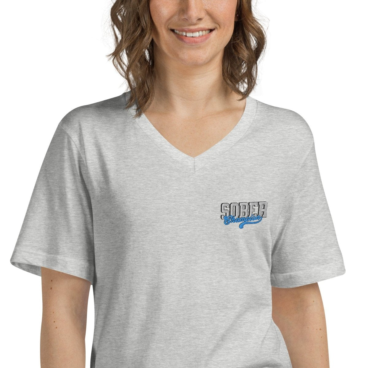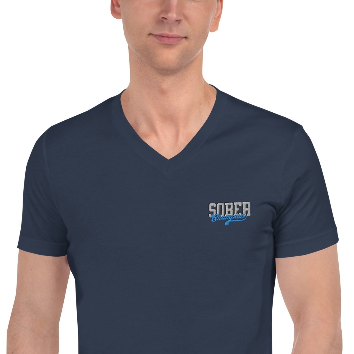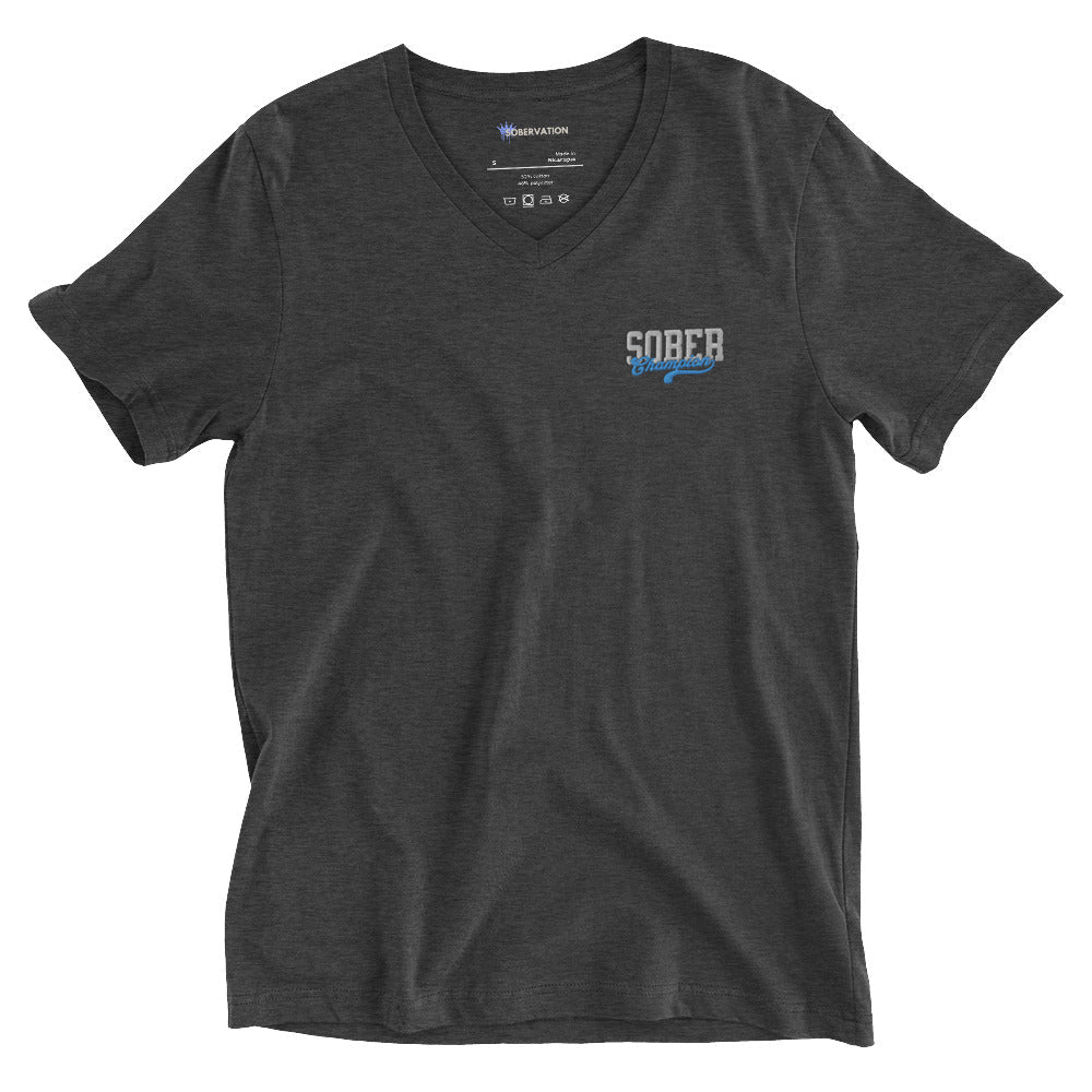 This isn't just a v-neck tee—it's a statement piece for those who understand that sobriety is a victory worth celebrating every single day. The words "Sober champion" are custom-embroidered on the left chest—a powerful declaration to the community that gets it: you've fought for this, you've earned this, and you wear it with pride.
