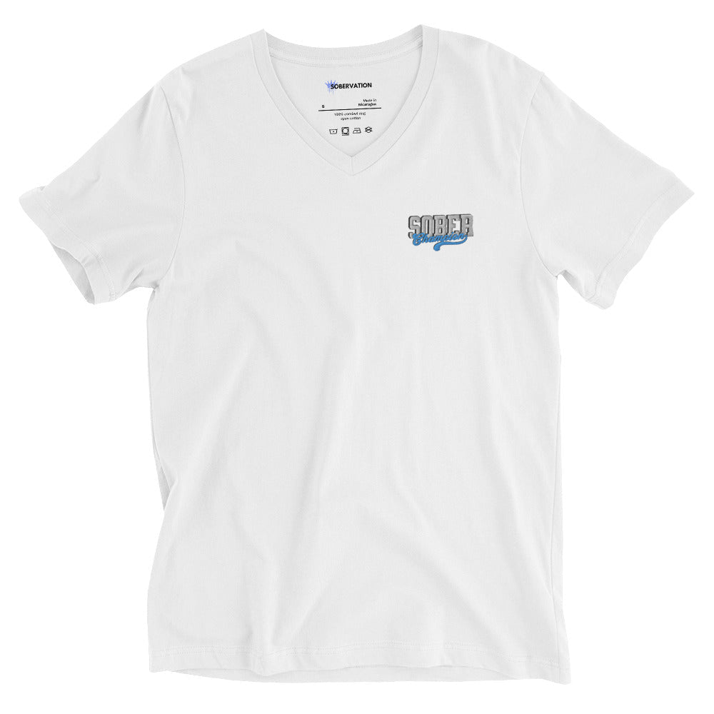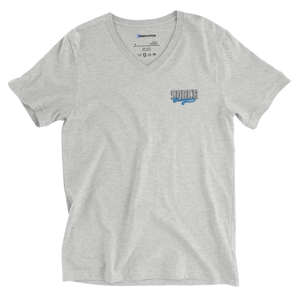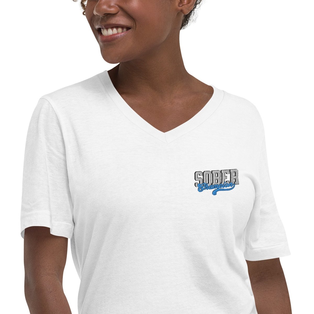 This isn't just a v-neck tee—it's a statement piece for those who understand that sobriety is a victory worth celebrating every single day. The words "Sober champion" are custom-embroidered on the left chest—a powerful declaration to the community that gets it: you've fought for this, you've earned this, and you wear it with pride.