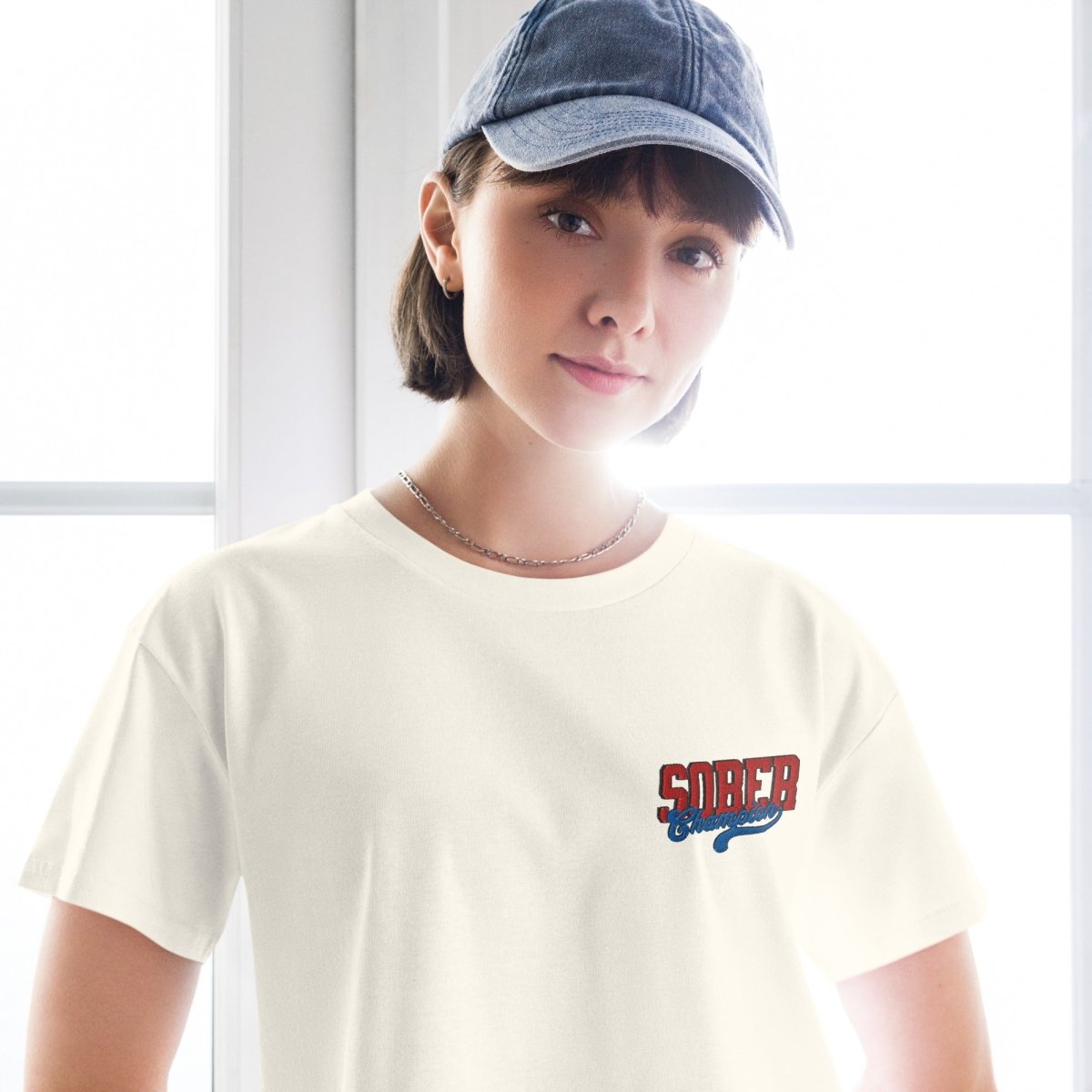 This cropped tee is embroidered with the Sober Champion message over the heart—a quiet but powerful nod to the strength you show every day. Designed for comfort, movement, and statement-making, this crop is your new go-to for warm days, gym fits, or layered empowerment.