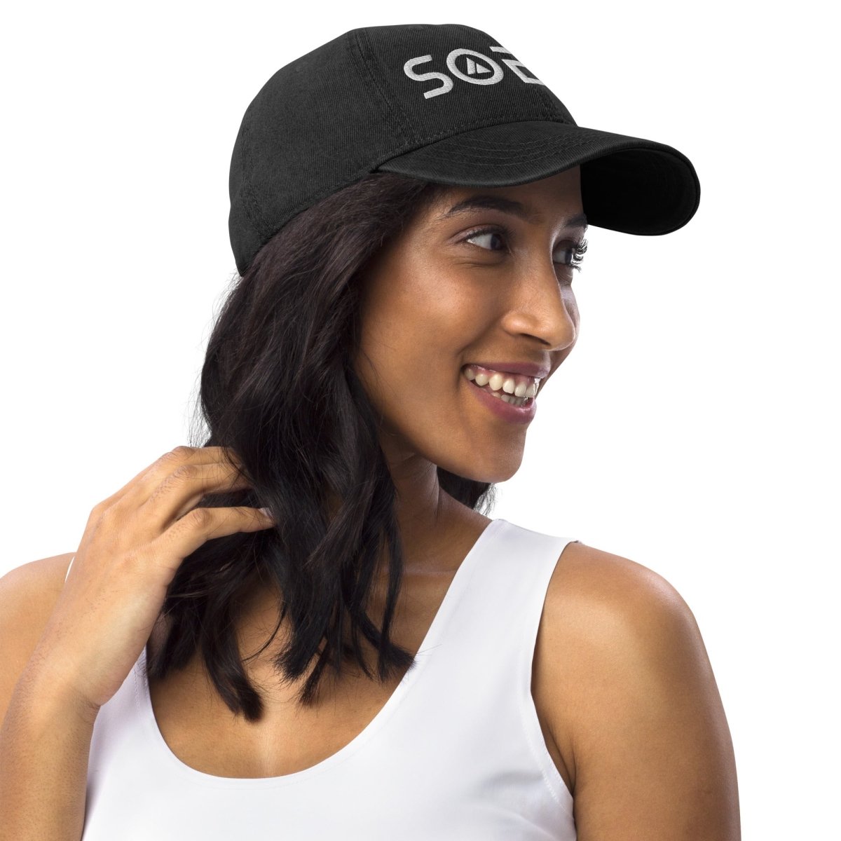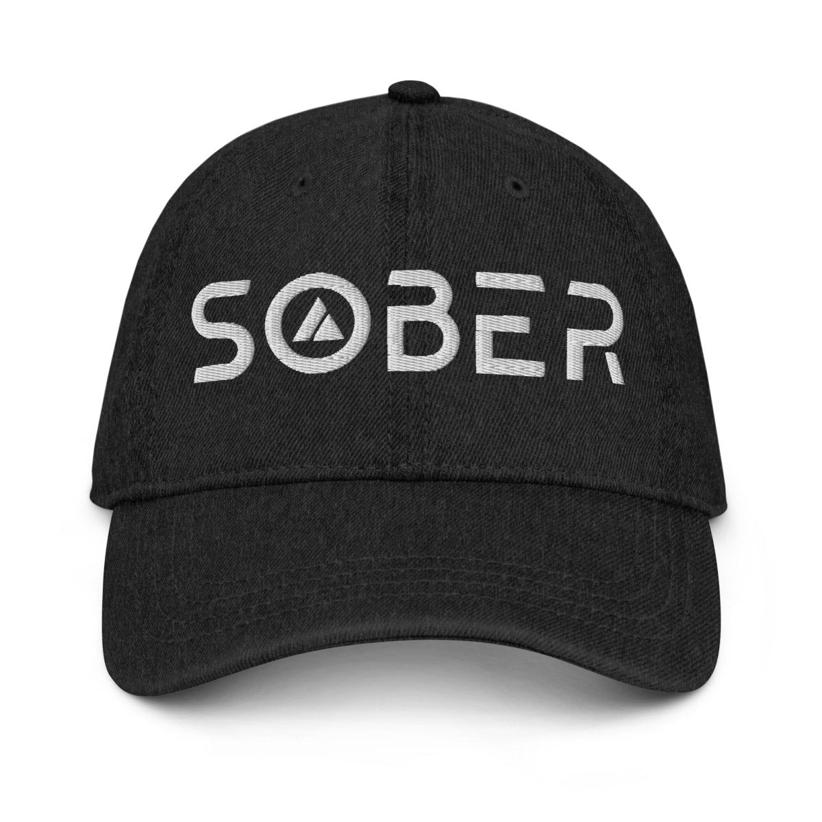 The "Sober" design in futuristic Skate Blade font—complete with the integrated sobriety triangle in the O—rendered in premium embroidery on this pigment-dyed denim cap. It's recovery symbolism reimagined with modern aesthetics, placed on a soft-crown silhouette that pairs effortlessly with everything from tees to hoodies. Each stitch adds dimension and tactile detail that elevates this beyond standard denim caps.