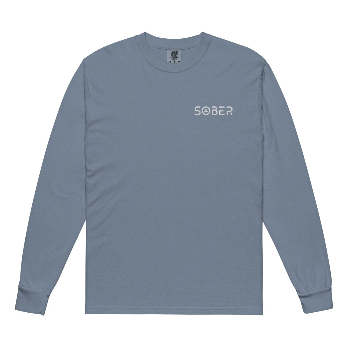 The "Sober" design in futuristic Skate Blade font—complete with the integrated sobriety triangle in the O—rendered in premium embroidery on this heavyweight long sleeve. It's recovery symbolism reimagined with modern aesthetics, placed to make a statement while maintaining the relaxed, lived-in character of the garment-dyed fabric. Each stitch adds dimension and tactile detail that elevates this beyond basic long sleeves.