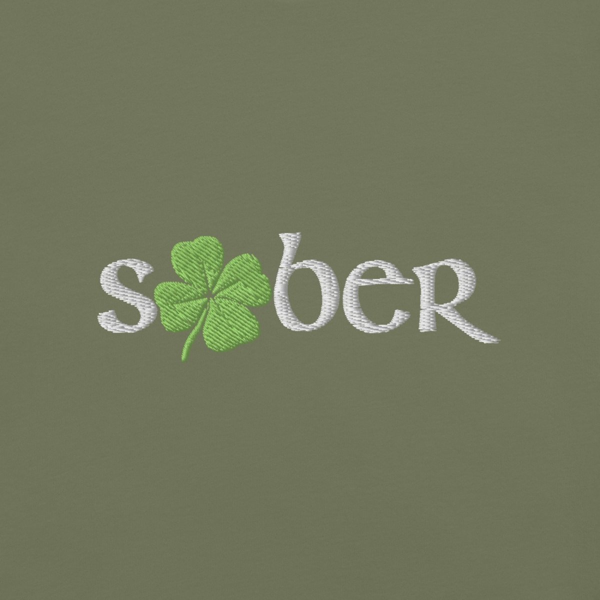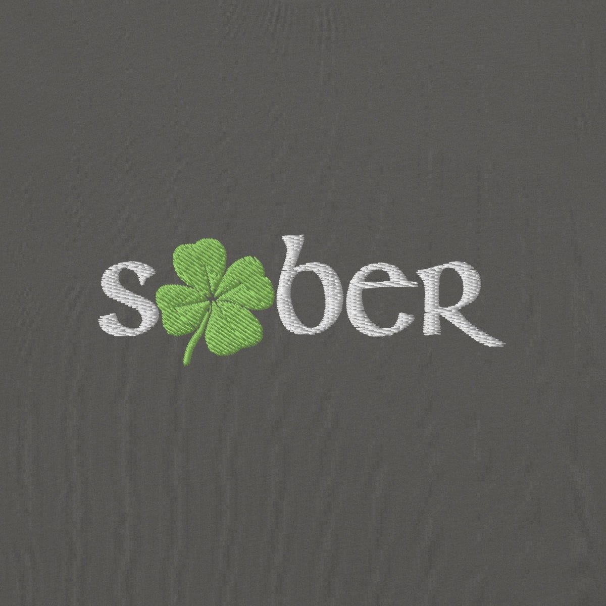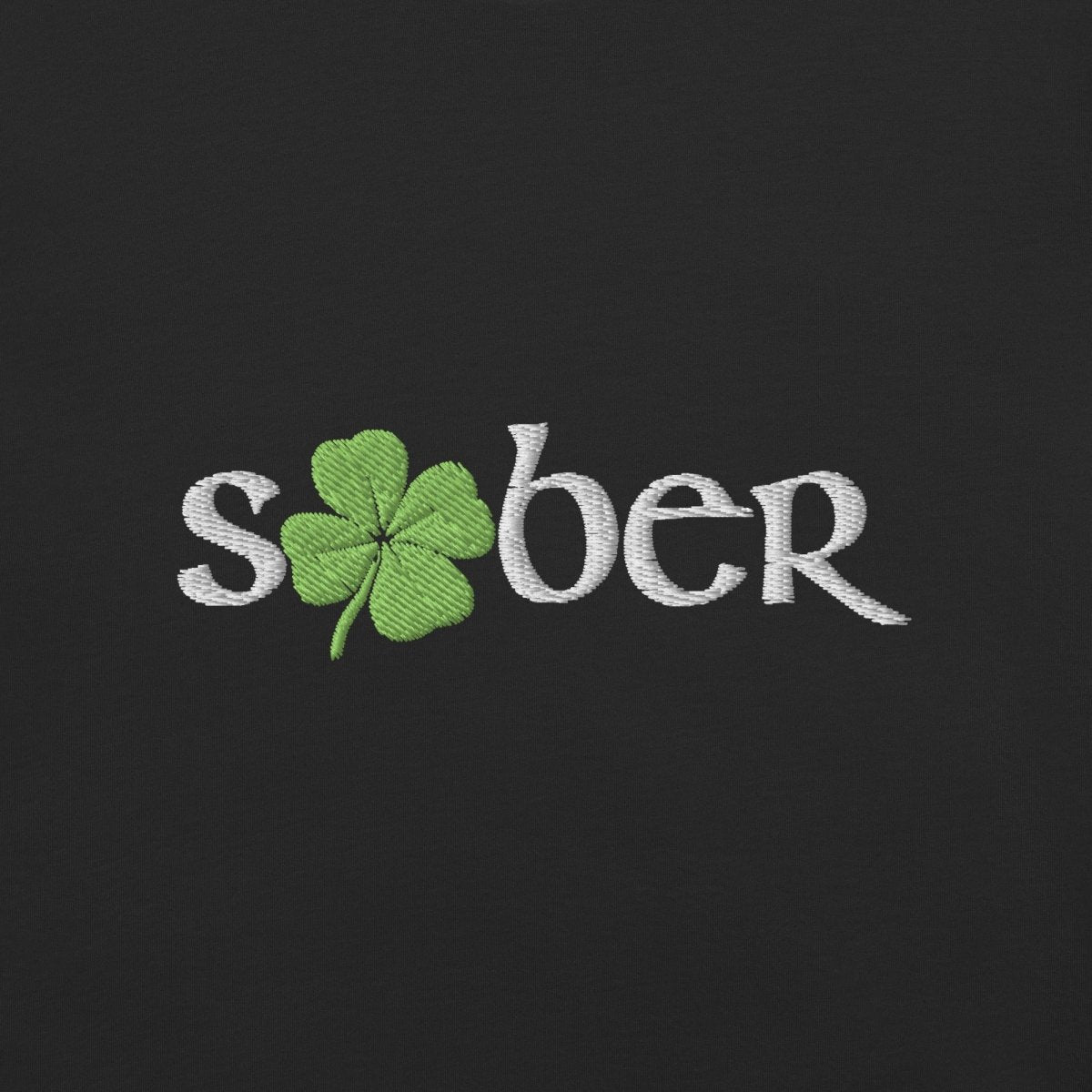 The word "Sober" in a Gaelic-inspired font with the O replaced by a four-leaf clover. Embroidered left chest for a clean, elevated look that celebrates St. Patrick's Day—and every day—with clarity, pride, and a little bit of luck.