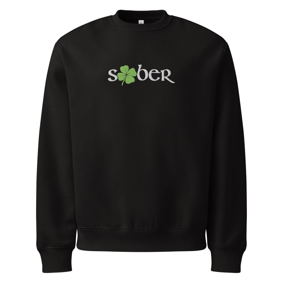 The word "Sober" in a Gaelic-inspired font with the O replaced by a four-leaf clover. Embroidered large center chest on an oversized heavyweight sweatshirt that's equal parts cozy and confident. This design doesn't hide—it celebrates.