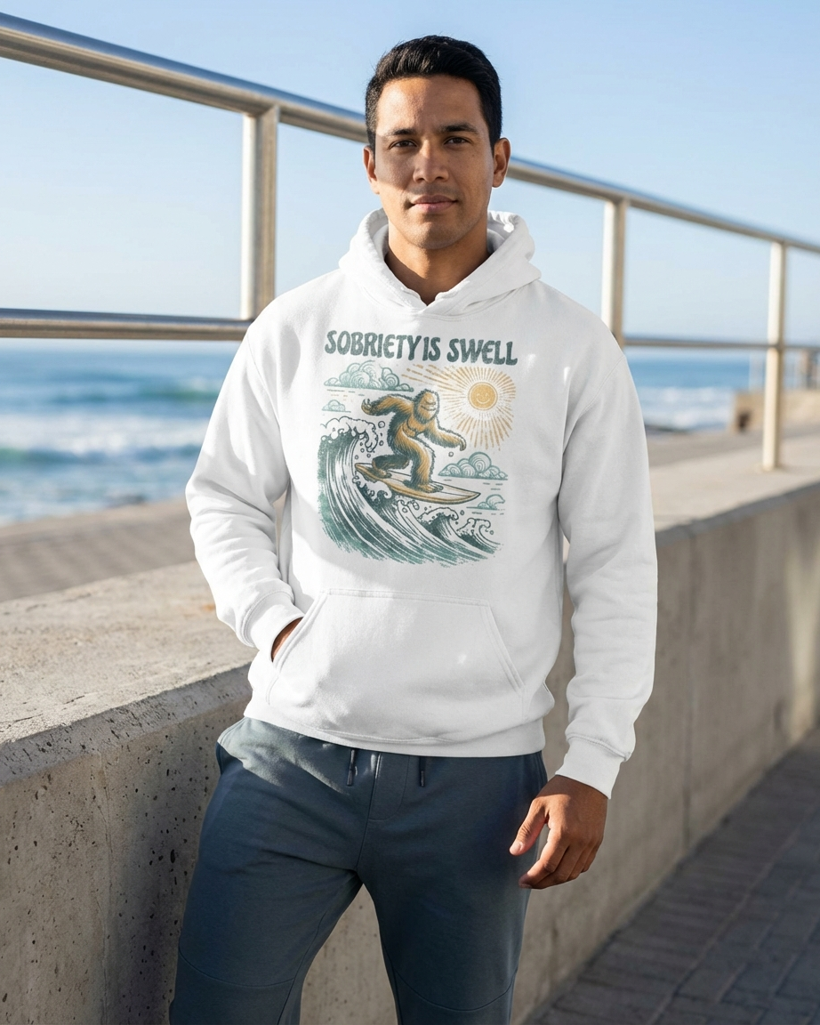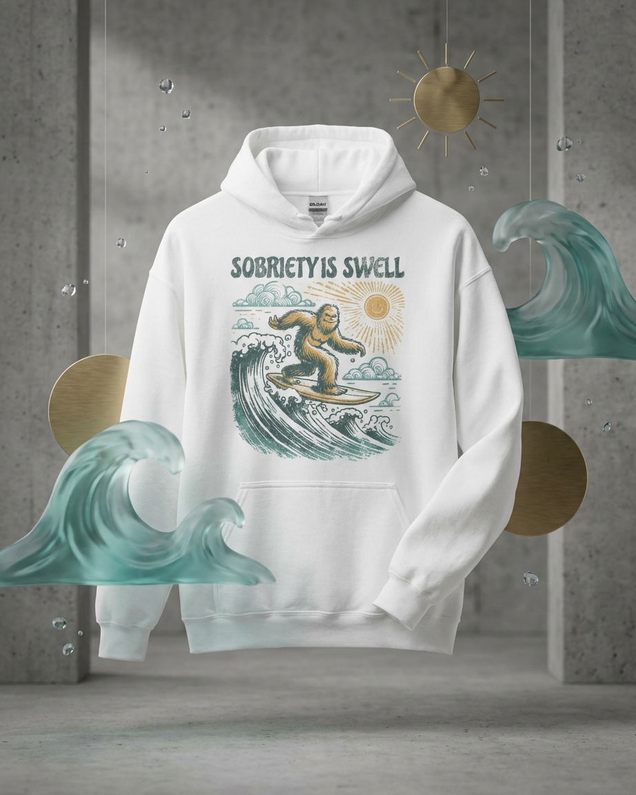 The Sobriety Is Swell Bigfoot Hoodie celebrates your recovery journey with vintage vibes and a touch of mystery. Featuring a retro Bigfoot/Sasquatch silhouette with "Sobriety Is Swell" messaging and groovy wave graphics, this premium Gildan 18500 hoodie honors the truth that sobriety is more than just okay—it's swell, it's cool, and it's the adventure of a lifetime.