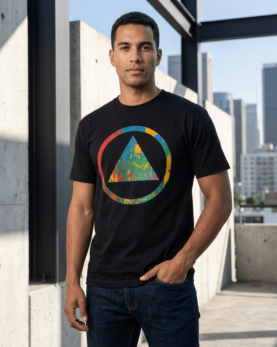 Wear your truth boldly. This unisex tee features the timeless recovery triangle-and-circle symbol, reimagined with vibrant paint strokes from an original artwork created during a moment of personal healing and reconnection. The rainbow-inspired design honors both the LGBTQ+ community and the daily journey of sobriety. It’s a statement of progress, pride, and purpose.