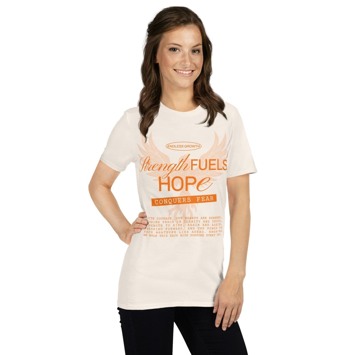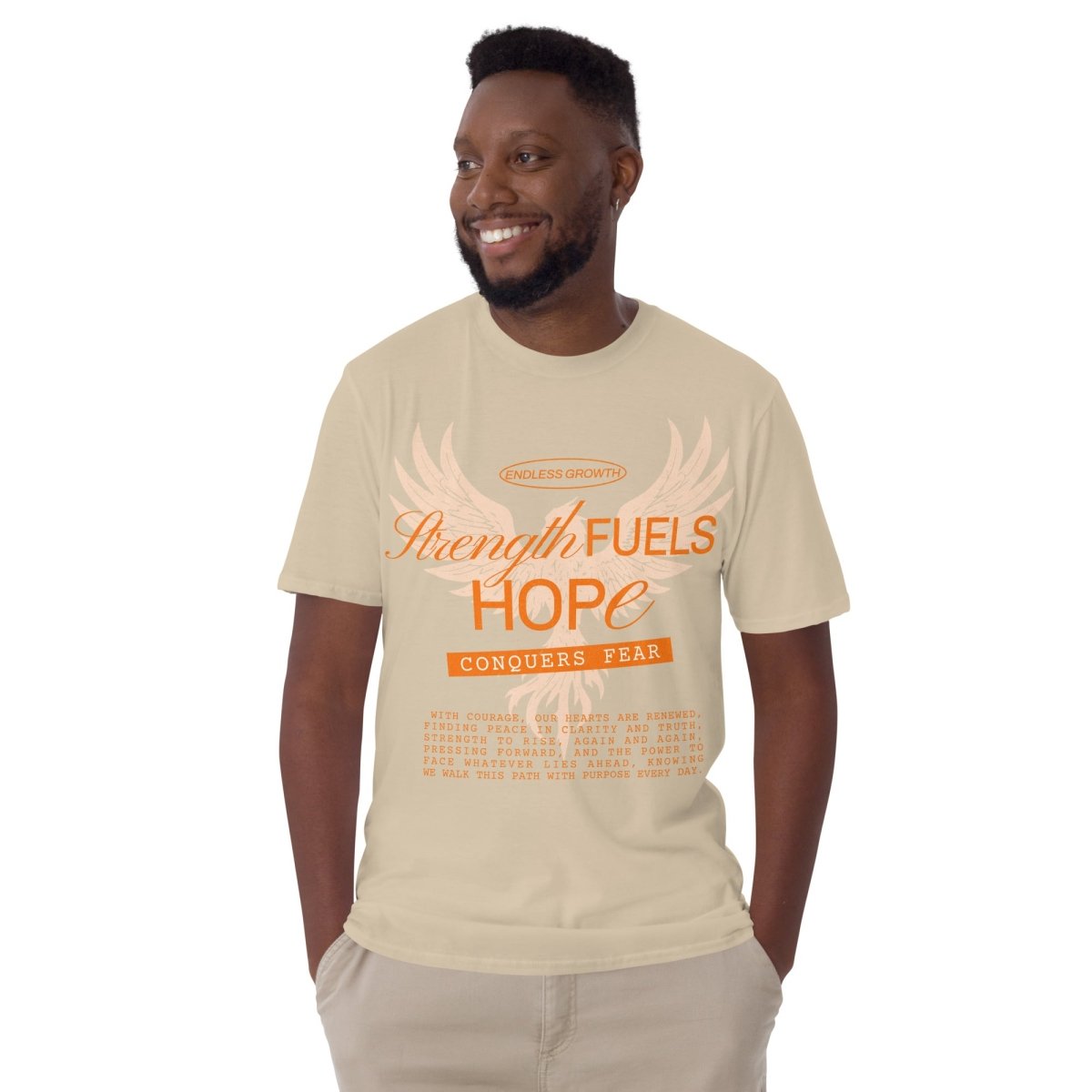 Let your resilience rise like a phoenix. This essential unisex t-shirt features a powerful message: "Strength Fuels Hope. Hope Conquers Fear." with a bold phoenix design and an empowering affirmation at the bottom. Crafted for comfort, this softstyle tee is made from breathable cotton and designed for everyday wear with purpose. Whether you're in recovery or just moving through life with intention, this shirt reminds you—and the world—of the strength within.